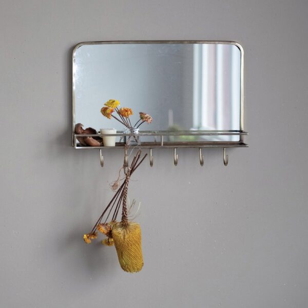 Metal Framed Wall Mirror w/ Shelf & 6 Hooks, Brass Finish