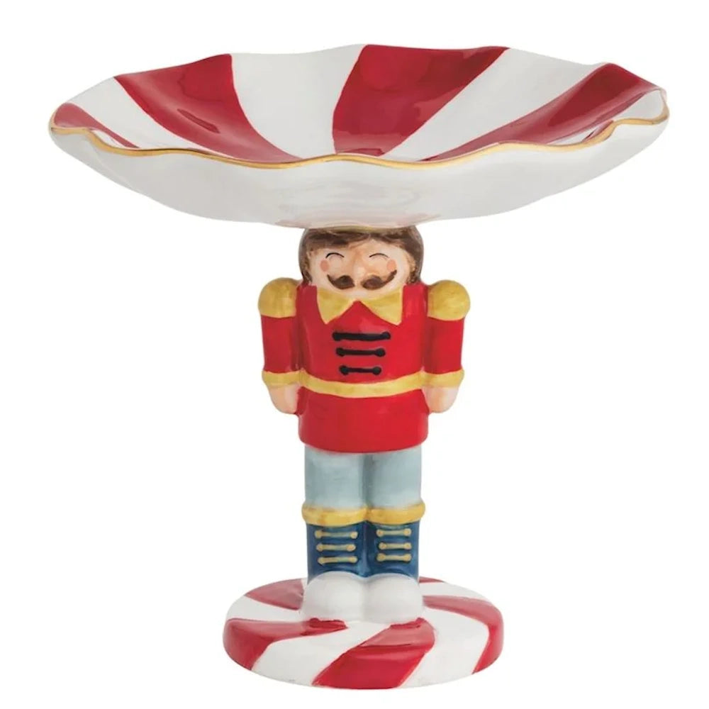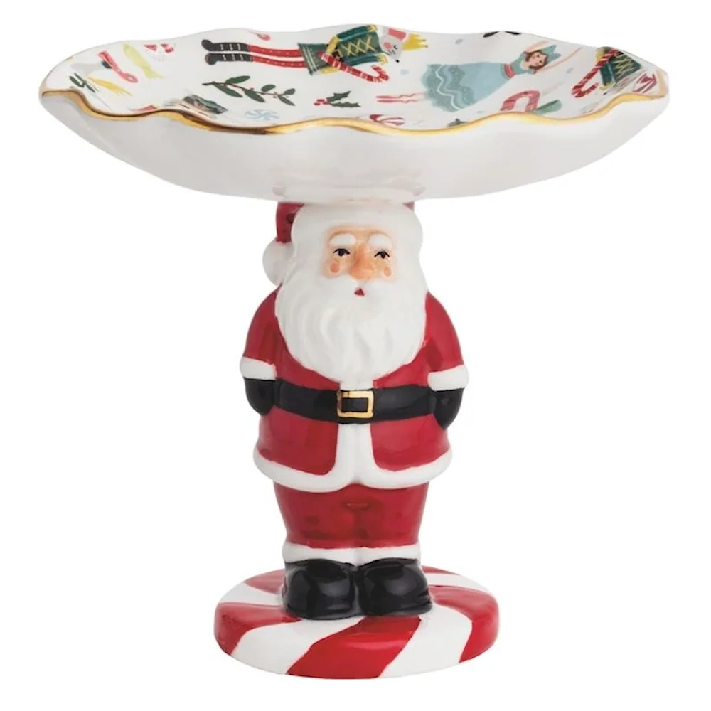 This festive ceramic dish features charming Christmas details and a classic pedestal base, perfect for candies, cookies, or decorative ornaments. A beautiful addition to your kitchen counter, coffee table, or holiday buffet, it brings elegance and cheer to any Christmas celebration. Ideal for entertaining or gifting, this Mud Pie candy dish adds timeless holiday sparkle to your décor.