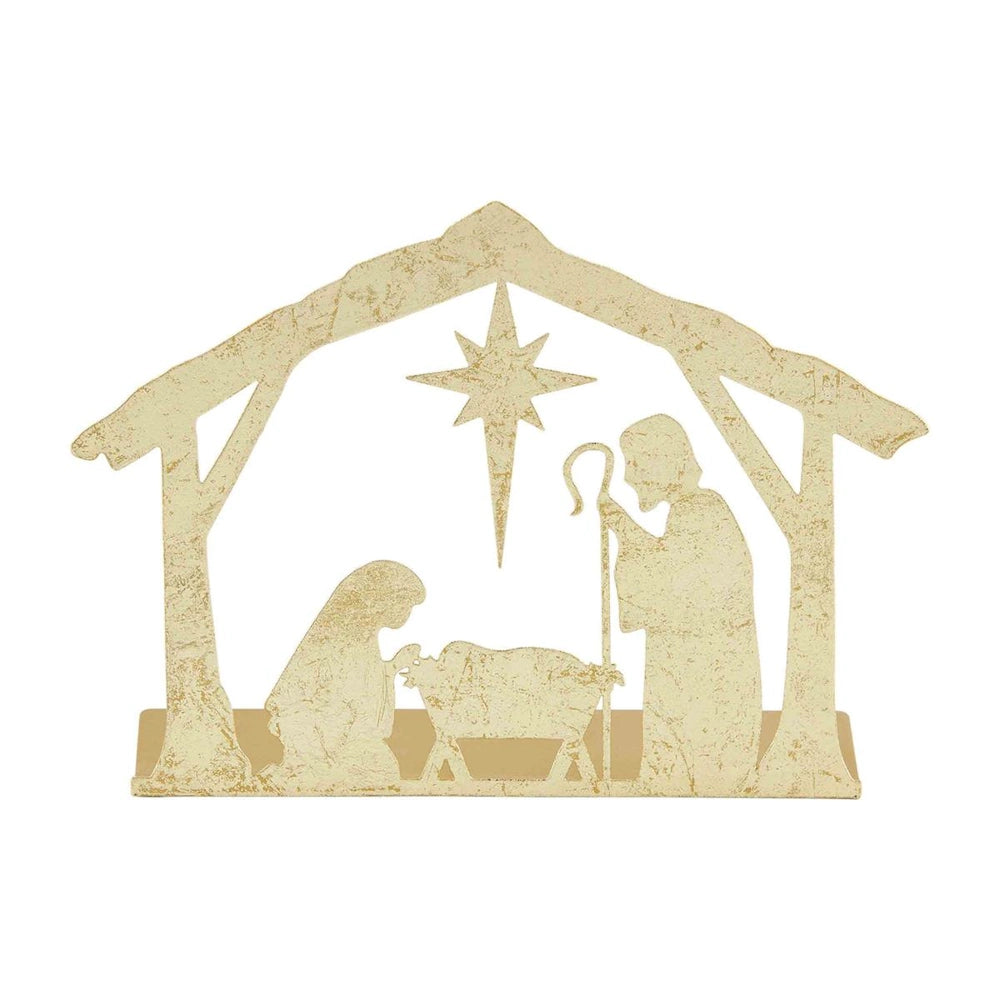 This elegant nativity set features delicately crafted tin figures in a shimmering gold finish, creating a timeless holiday centerpiece that radiates faith, peace, and joy.