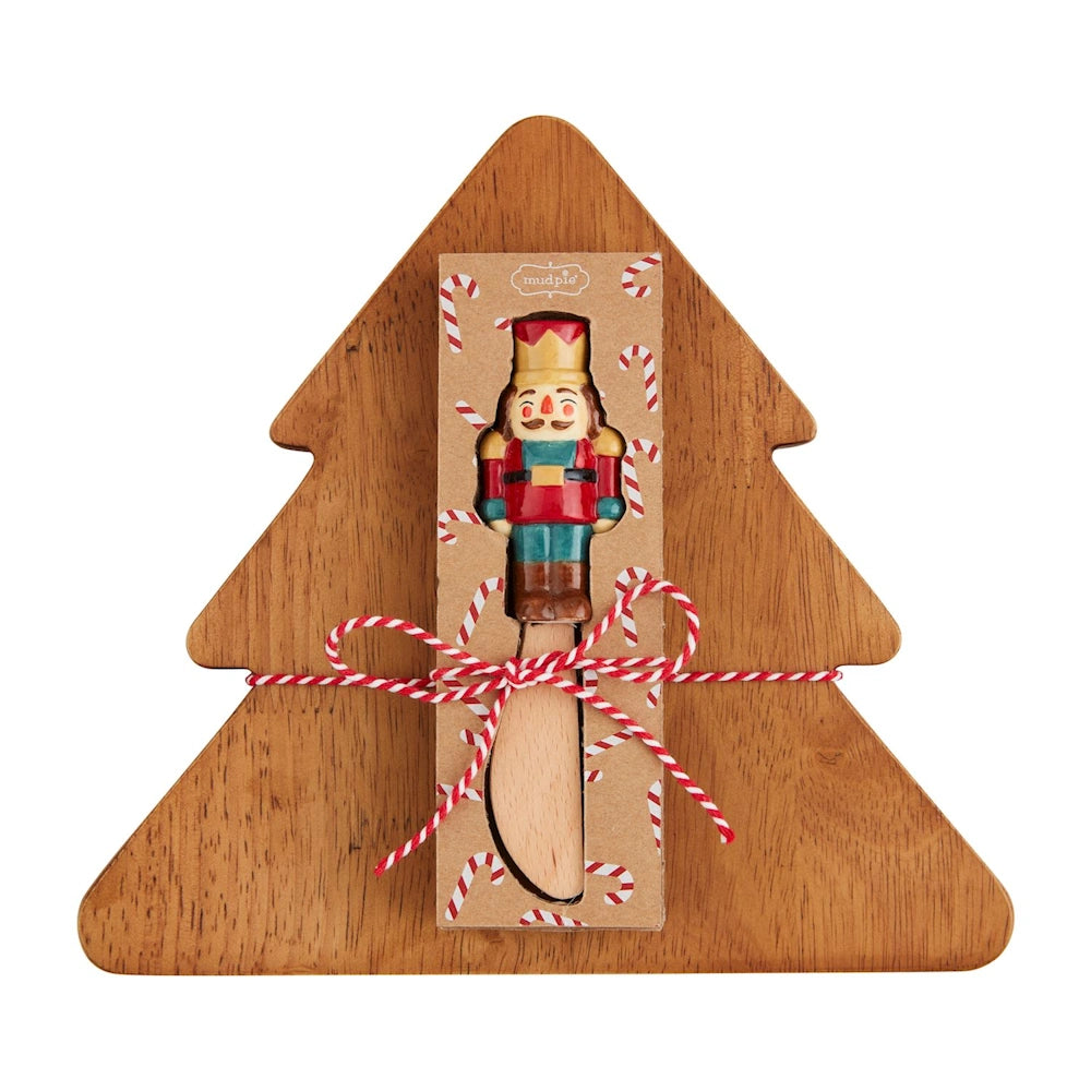 The set includes a tree-shaped board and a wooden spreader with a ceramic figural handle.