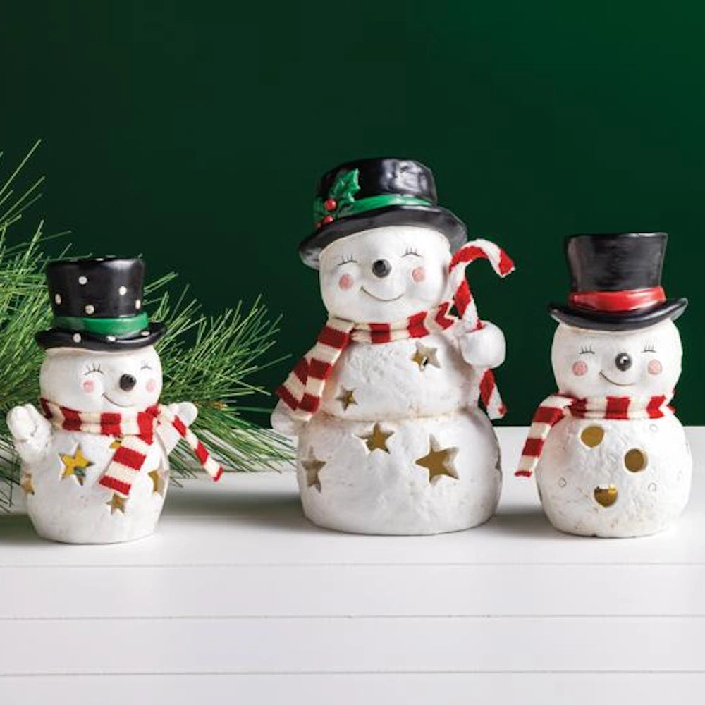 This enchanting snowman features intricately cut-out stars, allowing a gentle glow to illuminate your space when the attached flameless tea light is turned on.