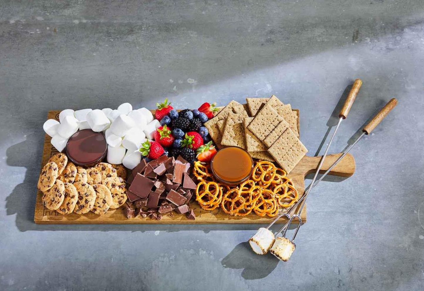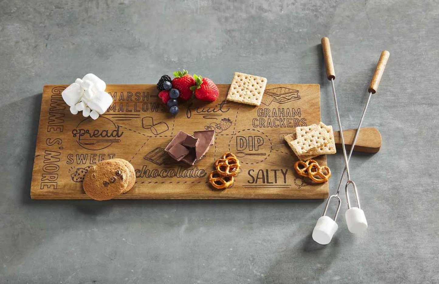 3-piece set. Mango wood board features engraved presentation "map." Comes with wood and metal roasting sticks.