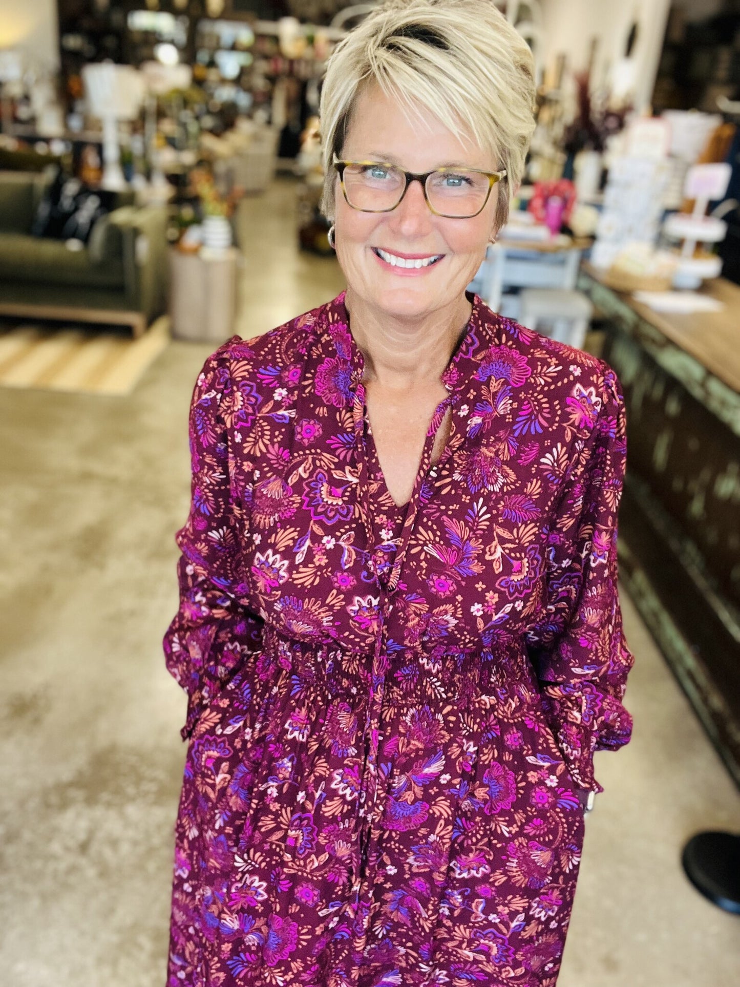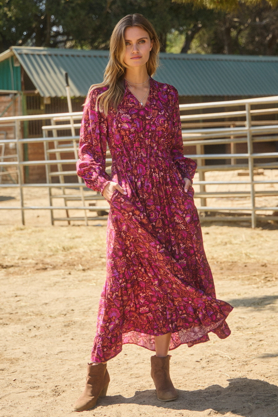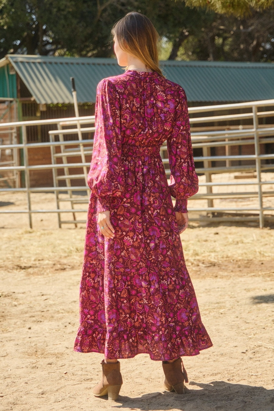 Ethic bohemian print tired maxi long sleeve dress with smocking details.