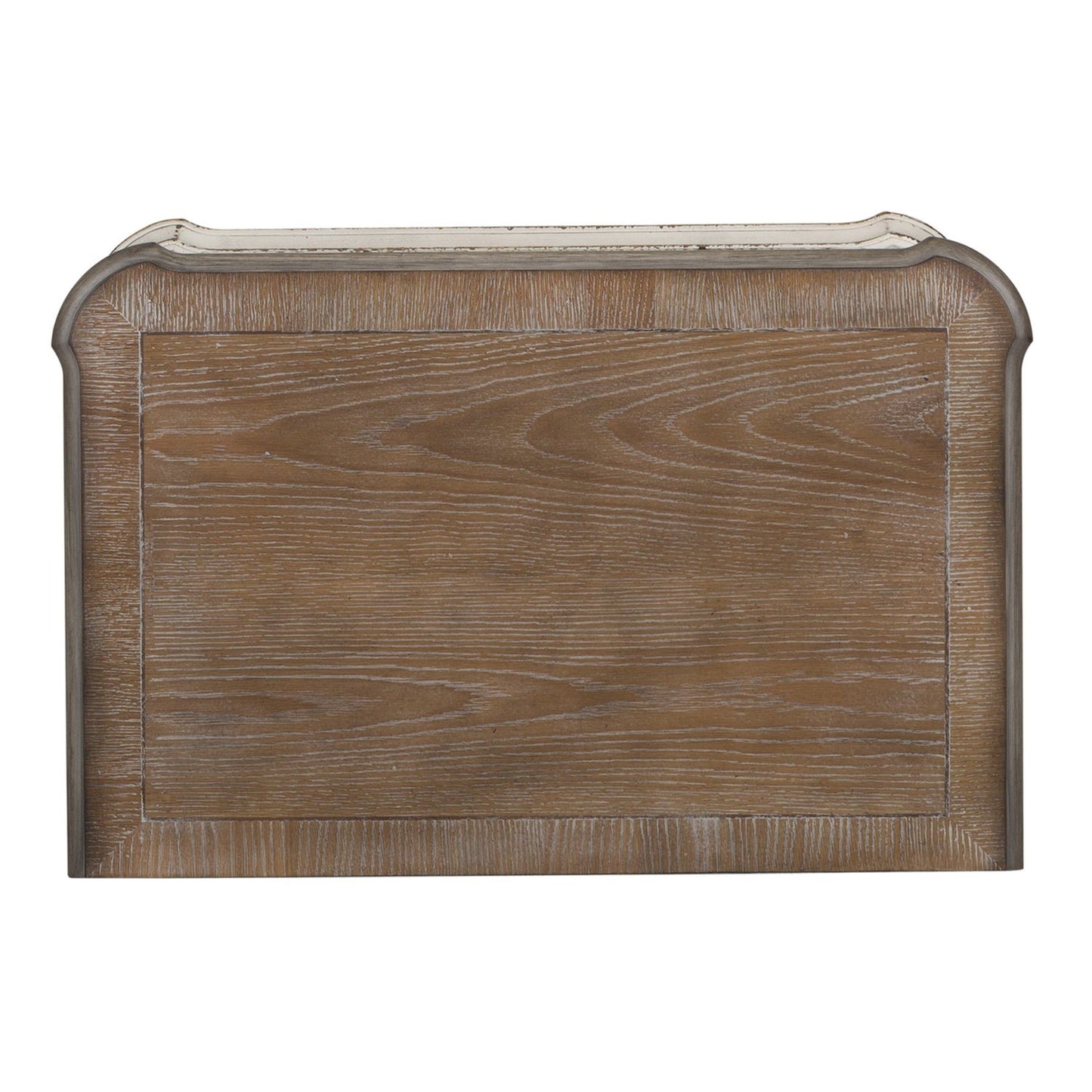 Crafted of poplar solids with white oak and birch veneers, this piece features canted corners and two fully stained full extension drawers with a lock system keeping valuables secured, wood framed drawer fronts, bead molding, and is accented by bail pull hardware in an antiqued pewter. The top is finished in a weathered brown with whitewash and has rounded pilasters. Warm antique finishes and artistic distressing along with grand scale create a piece to be passed to generations.