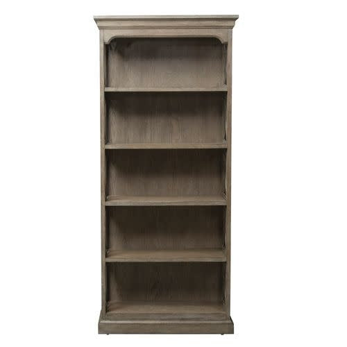 Crafted with rubberwood solids and cathedral white oak veneers, this piece features bead molding, crown molding, and open side panels with a decorative grid overlay. Store your books and decorative accessories on the four shelves and bottom panel that acts as a fifth shelf. The heathered taupe finish creates a neutral look, sure to be the perfect addition to any space or home office.