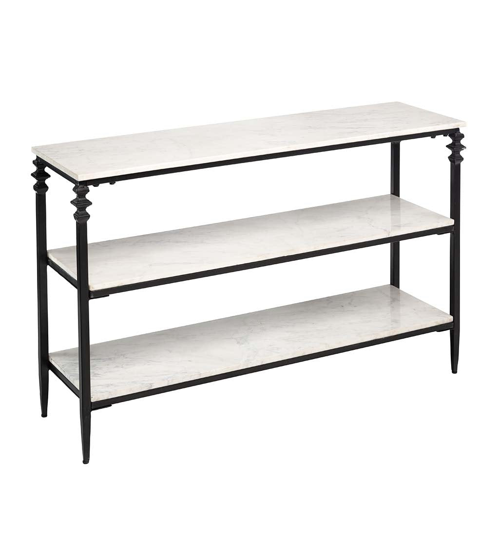 Three shelves are supported by a metal frame; legs have a graceful turned detail. Metal is powder coated for durability; a layer of iron sheet adds extra support under the marble surfaces.