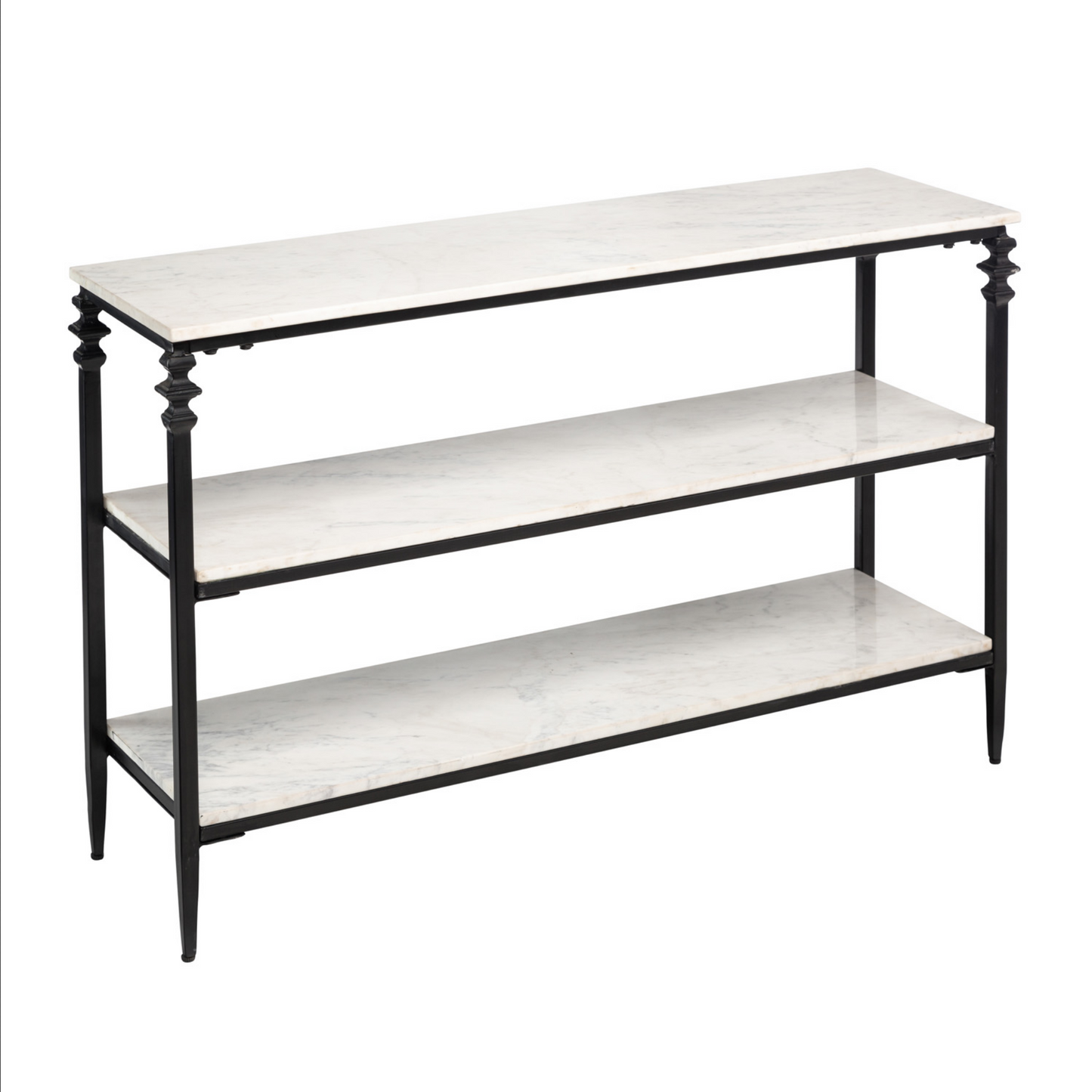 The white marble shelves with a black metal frame create a striking contrast in this stunning piece, yet the neutral palette works with any color scheme.