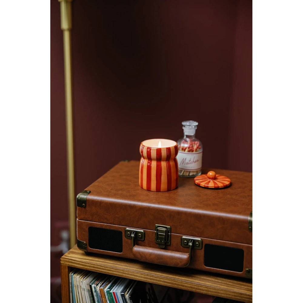 Red/Coral Striped Cabana with Lid Candle - Spiced Apple
