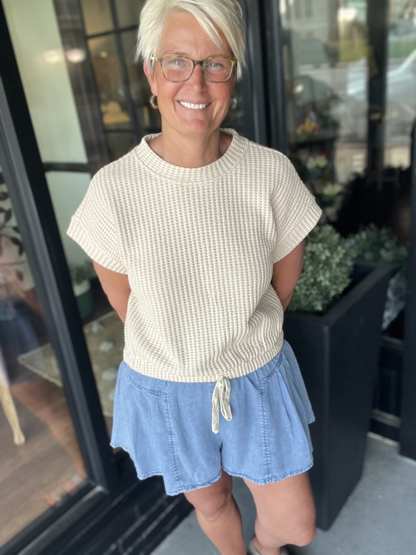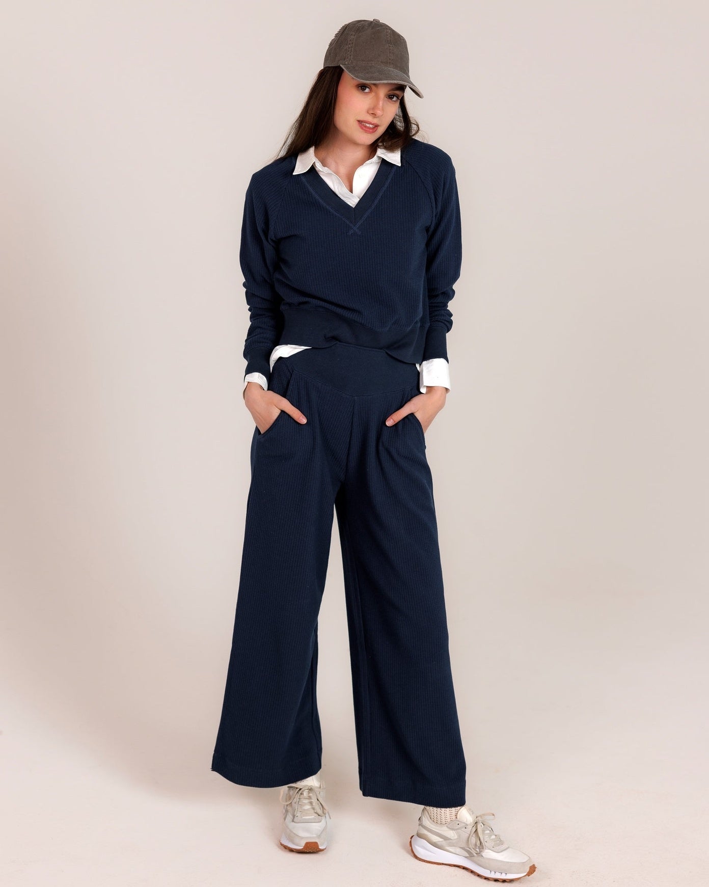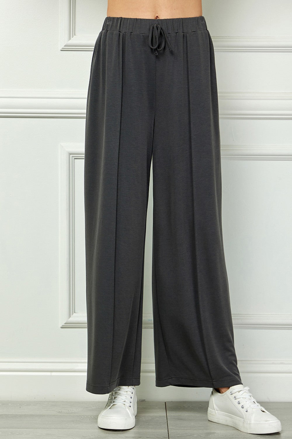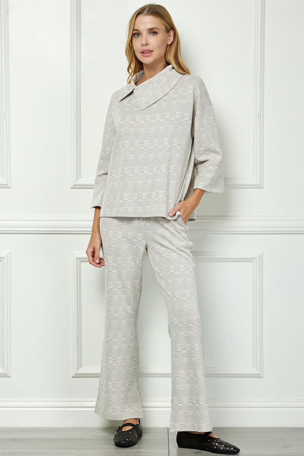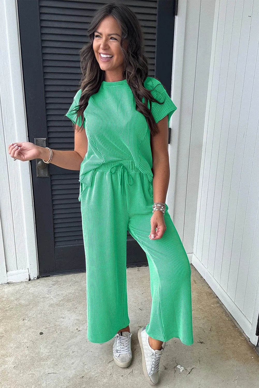 Solid Corded Short Sleeve Shirt and Wide Leg Pant Set