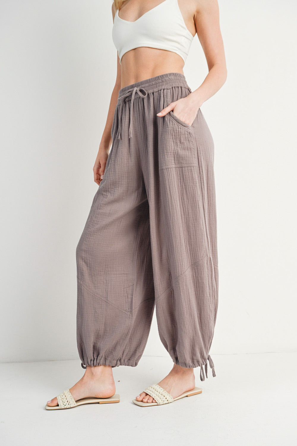 Jogger harem drawstring pants offer a perfect blend of comfort and style. These pants typically feature a relaxed fit with a dropped crotch, combining the casual feel of joggers with the loose and roomy design of harem pants.
