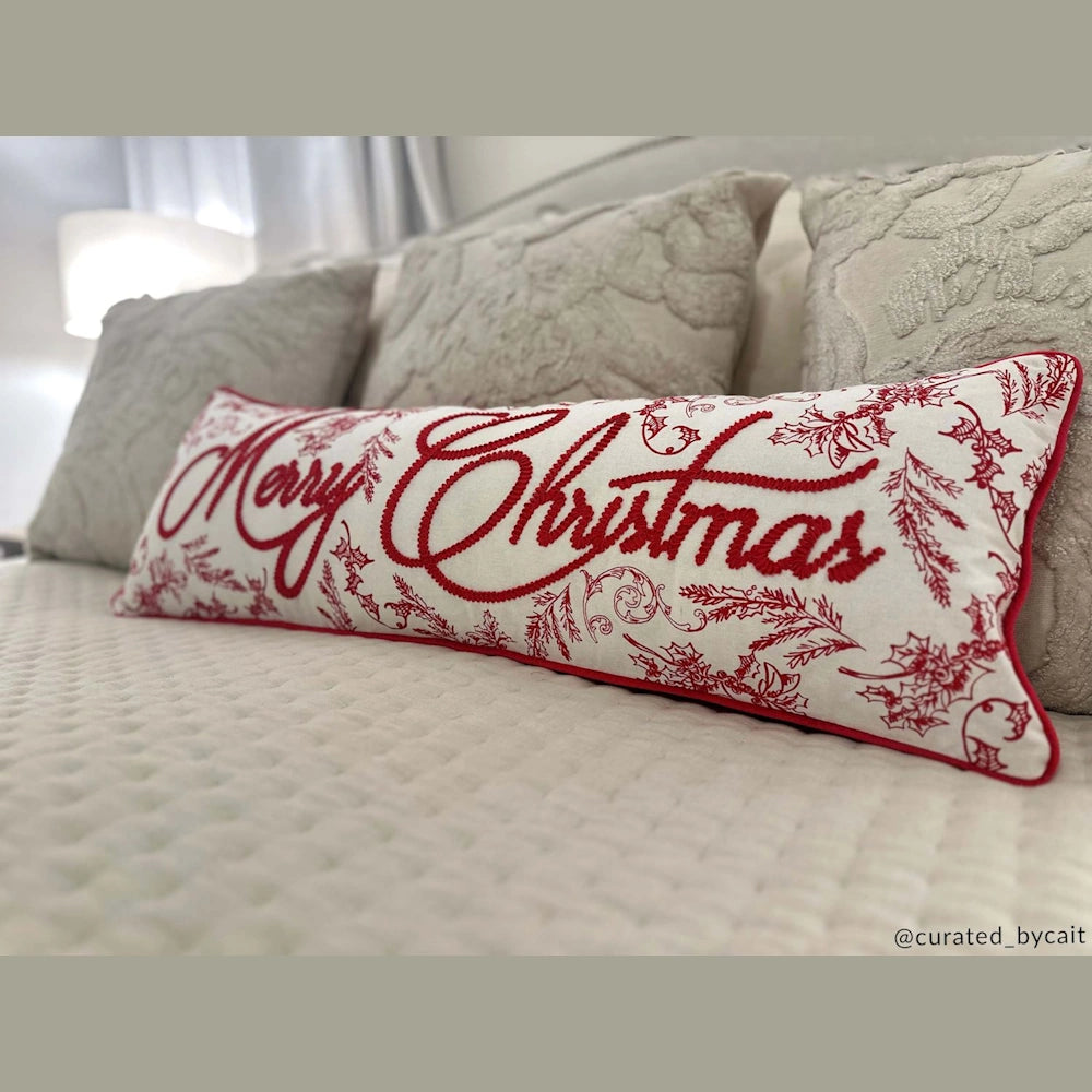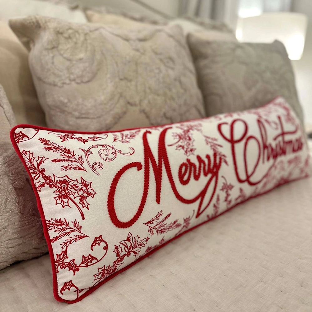 The Merry Christmas Toile Pillow is a beautifully crafted piece that will add a touch of elegance to your home decor.