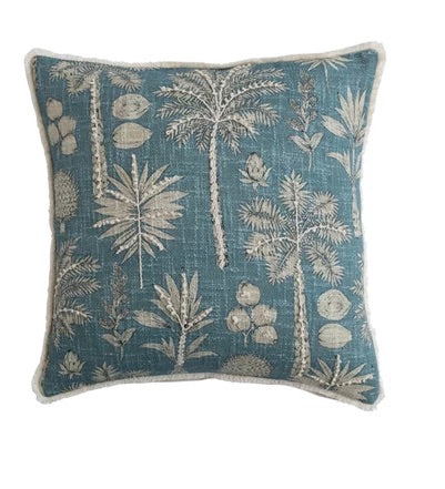 Embroidered Cotton Pillow with Chambray Back and Fringe