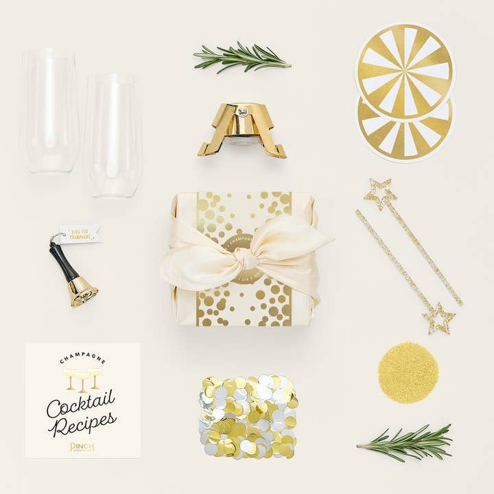 It's always time to celebrate with a luxe Champagne Kit by Pinch Provisions! This delightful assortment of effervescent accessories & essentials is ready to gift in a Furoshiki-style bow box.
