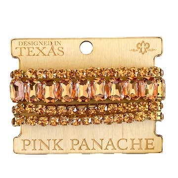 This bracelet set has four strands of peridot green rhinestones in rectangle and round shapes. It stretches for ease of wear. One size fits most.