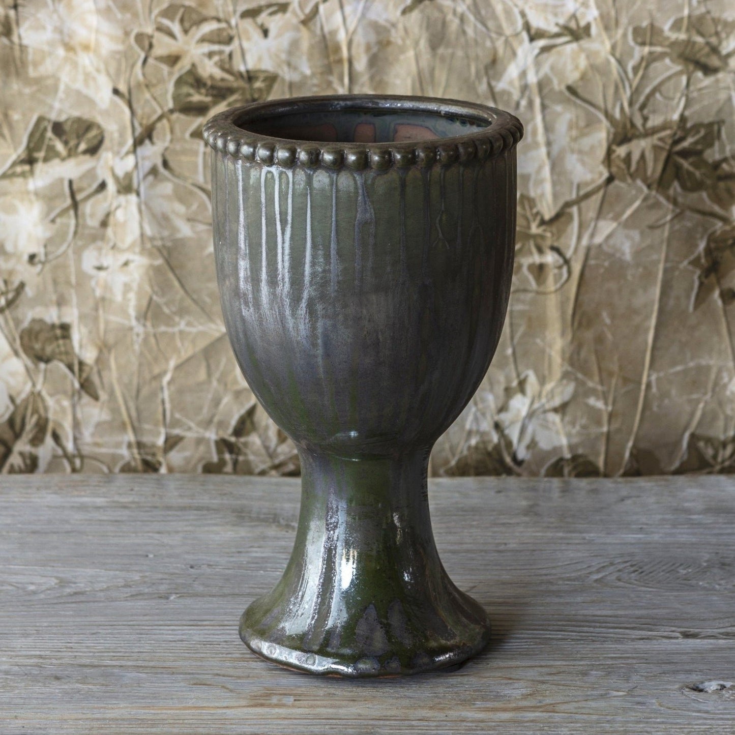 Aged Olive Dripped Glazed Pottery Large Tulip Vase