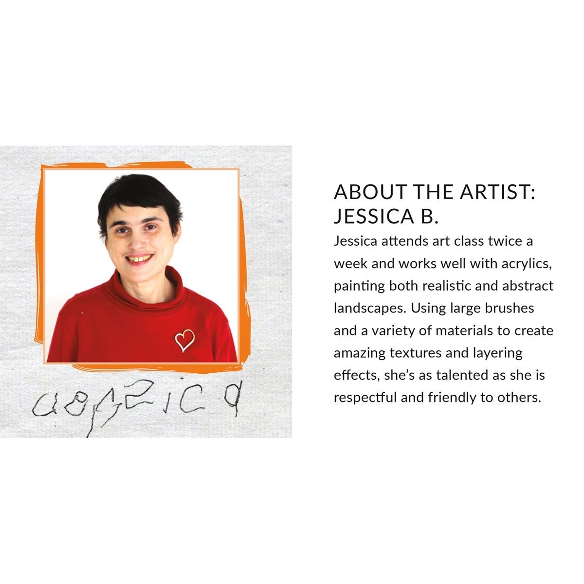 Contains predrilled back keyhole for easy hanging or can free-stand alone. Complements well with coordinating pieces in collection for a refreshing, gallery-inspired display. About the Artist: Jessica attends art class twice a week and works well with acrylics, painting both realistic and abstract landscapes. Using large brushes and a variety of materials to create amazing textures and layering effects, she’s as talented as she is respectful and friendly to others. A portion of the proceeds from this sale will be donated to this local gallery to continue their mission to promote artistic expression for local artists.