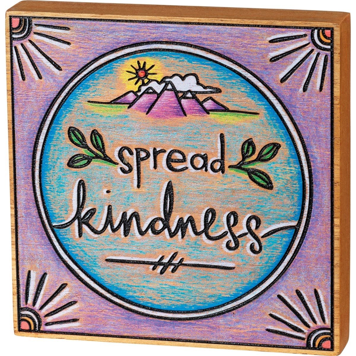 A wooden block sign featuring a woodburned "Spread Kindness" sentiment with colorful sun and mountain designs. Contains predrilled back keyhole slot for easy hanging or can free-stand alone.