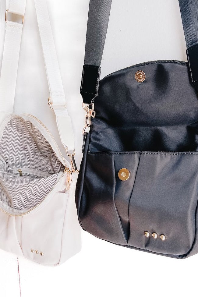 This accessory includes an exterior top zipper pocket on the back, an exterior front pocket hidden under the main zipper with a snap closure, both an interior zipper pocket and an interior open pocket, as well as an adjustable strap. This bag is roomy and makes it so easy to keep all your goods organized. Its washed nylon material makes it the perfect all year round bag and is guaranteed to be a show stopping outfit completer! Available in 2 colors including cream and black.