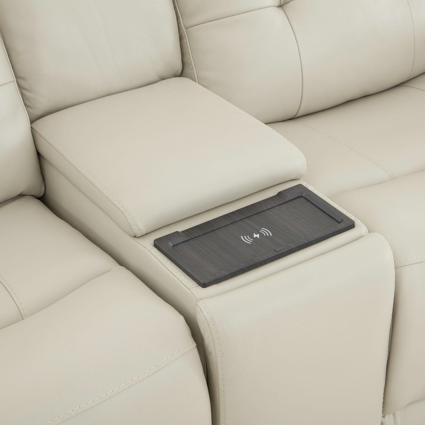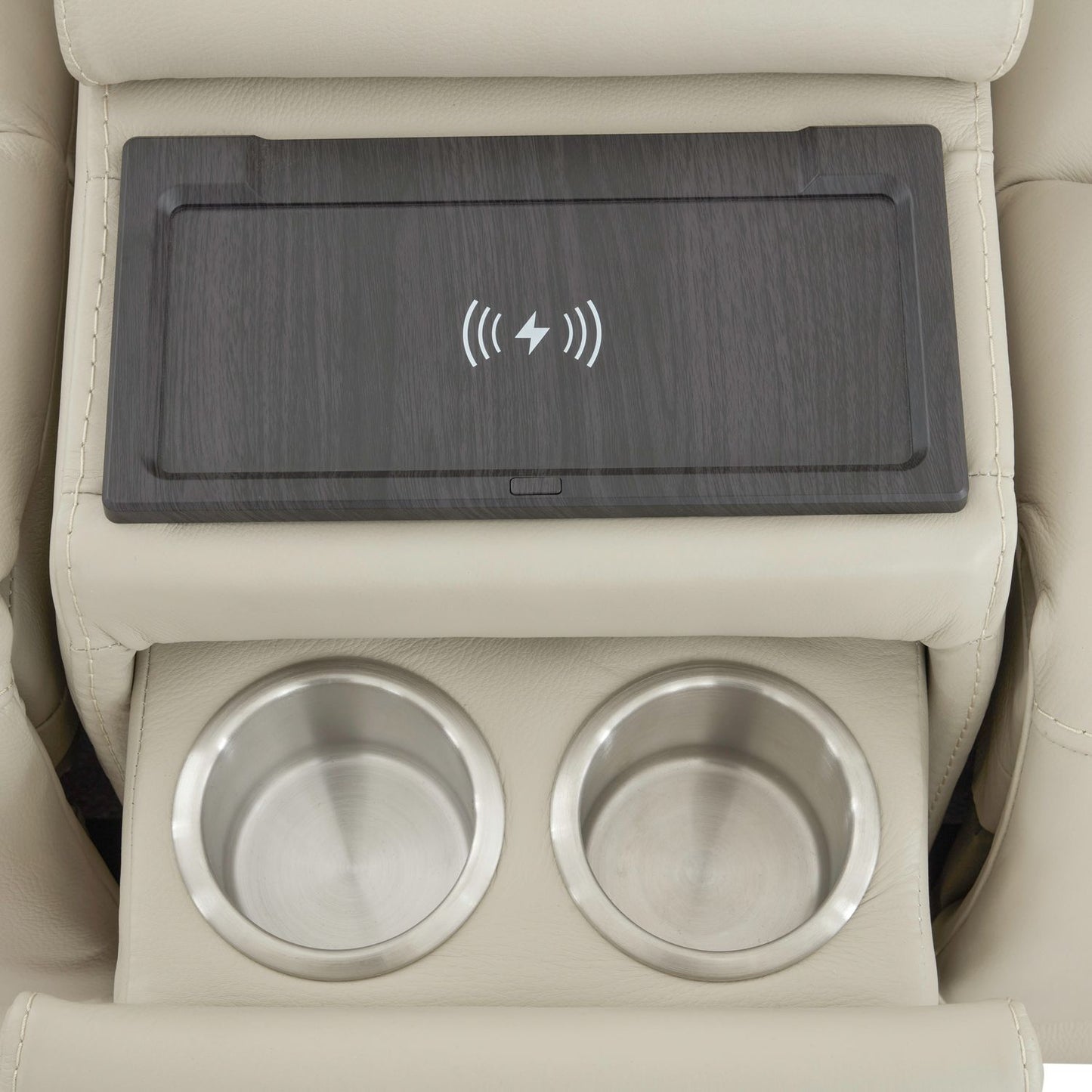 Kick up your feet and relax with the Carrington loveseat with console. Crafted with Solid Hardwood, Plywood, and Laminated Veneer Lumber, this loveseat features a Semi-Aniline Top Grain Leather with Match in a Baja Stone finish. PVC Vinyl is matched to the leather and used on the outside backs and sides, meaning everywhere your body touches is real genuine leather! The Carrington loveseat with console offers triple zero gravity power recline with an articulating headrest and powered lumbar support for optimal comfort. The zero gravity recliner mechanism has shown to have immense health benefits including better blood flow and helping those struggling with posture issues. In zero gravity, the neutral spine position can strengthen back muscles, decompress the spine, and reduce tension or discomfort in the neck and shoulders, resulting in enormous benefits on posture. An added layer of memory foam is added to the bucket seats, meaning this sofa is not only a dream to lounge in, but is built to last. The full pad-over chaise ensures head-to-toe support. The contrast single stitching, attractive welt trim, and tufted pub back with a French seam works in any décor and is sure to delight the eye. A USB-A and USB-C charging port is located on each end of the loveseat. The console has a flip-open top with deep interior storage and an AC and USB-A charging port located within. A wireless charging pad adorns the top of the console for extreme convenience. Wow your friends by pushing the power button on top of the console and watch the bottom section open like magic to reveal two hidden, stainless steel, removable and washable cupholders! Lounging has never looked so good with the Carrington loveseat with console.