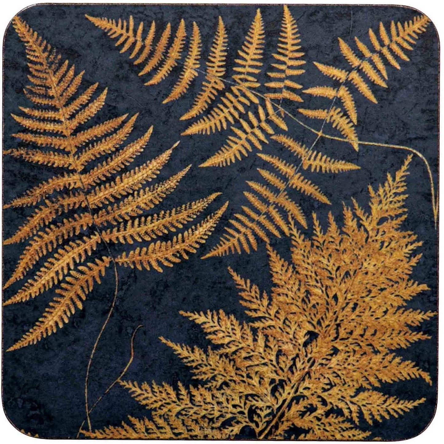 This set of four square coasters features gold ferns that pop on a navy blue background. These coasters are scratch-resistant, and the cork-backed set is great for entertaining! The set of 4 comes in a nice box perfect for gifting.