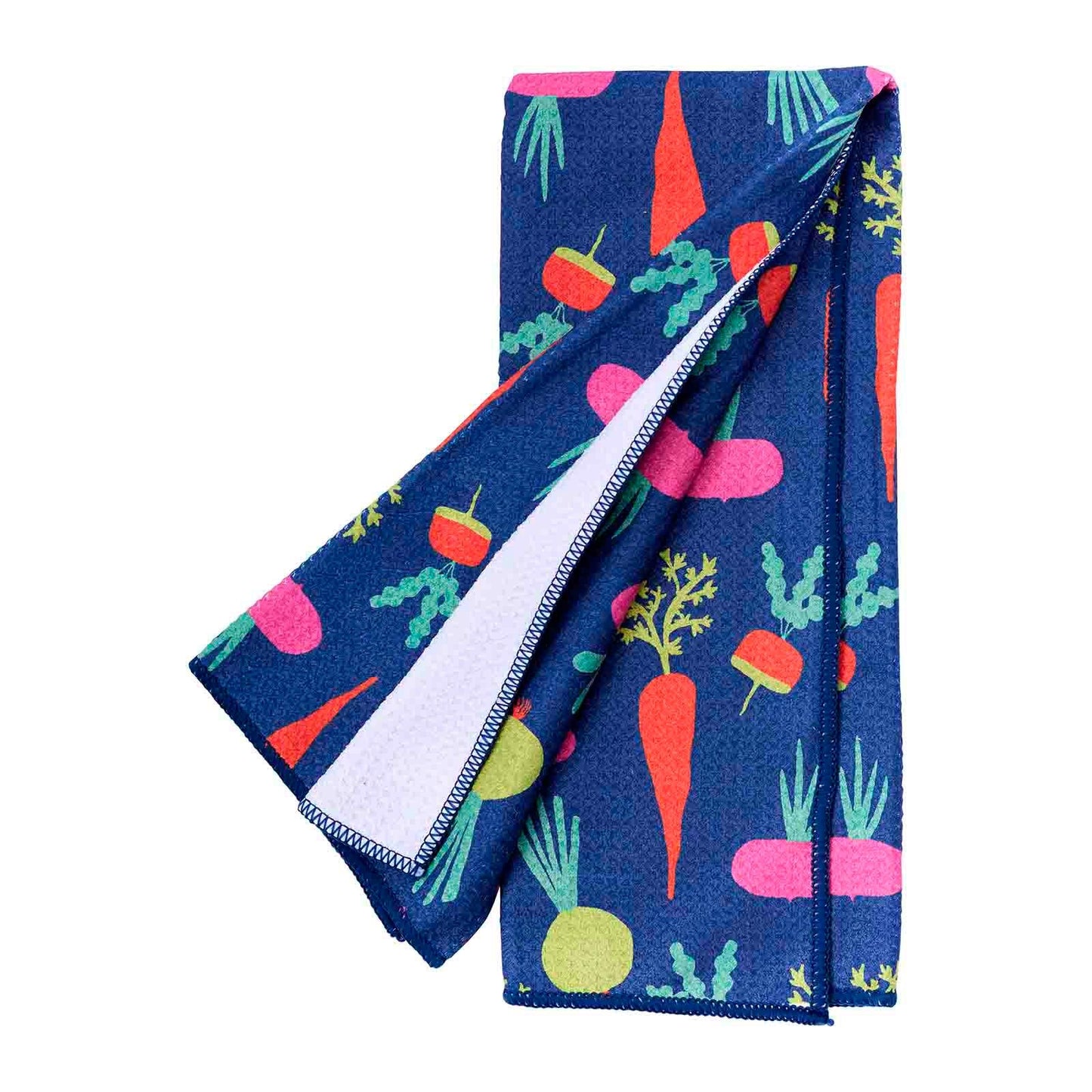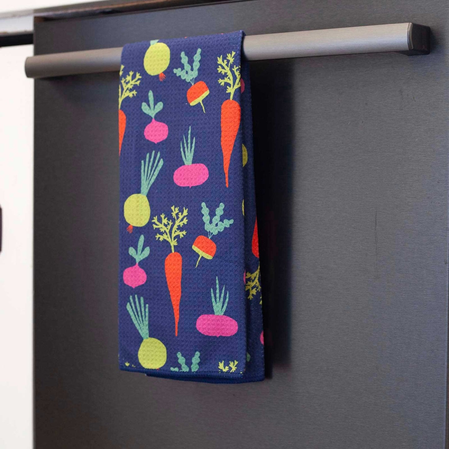 Fan-favorite root veggies on our new eco-friendly kitchen towels! Each vibrantly colored vegetable pops against the navy blue base of the towel and is sure to make a playful statement in your kitchen.