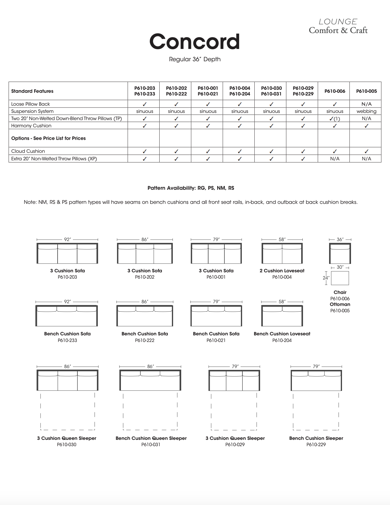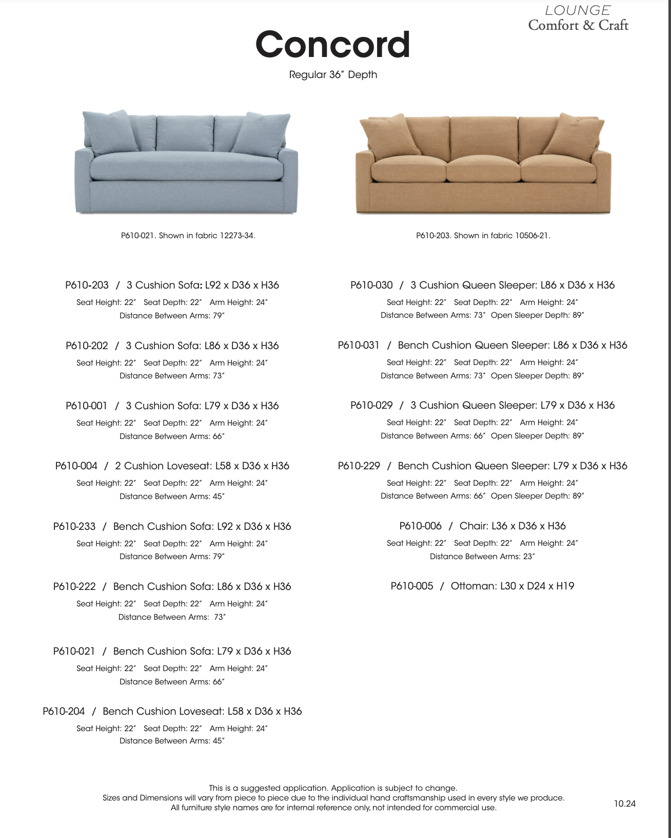 Overall Height (610) 36” (611) 37”, Seat Height 22”, Seat Depth (610) 22” (611) 25”, Arm Height 24”