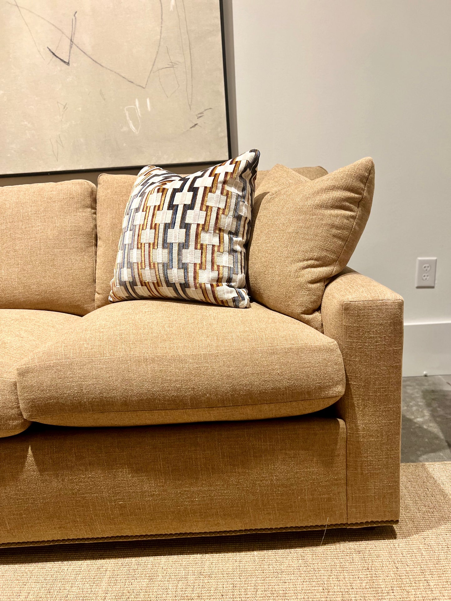 This sofa offers the perfect balance of modern lines and inviting comfort. Upholstered in a warm, textured fabric, it features deep, plush cushions and supportive back pillows that make it ideal for everyday living. The clean track arms and tailored silhouette give it a versatile style that works beautifully in both casual and refined spaces.