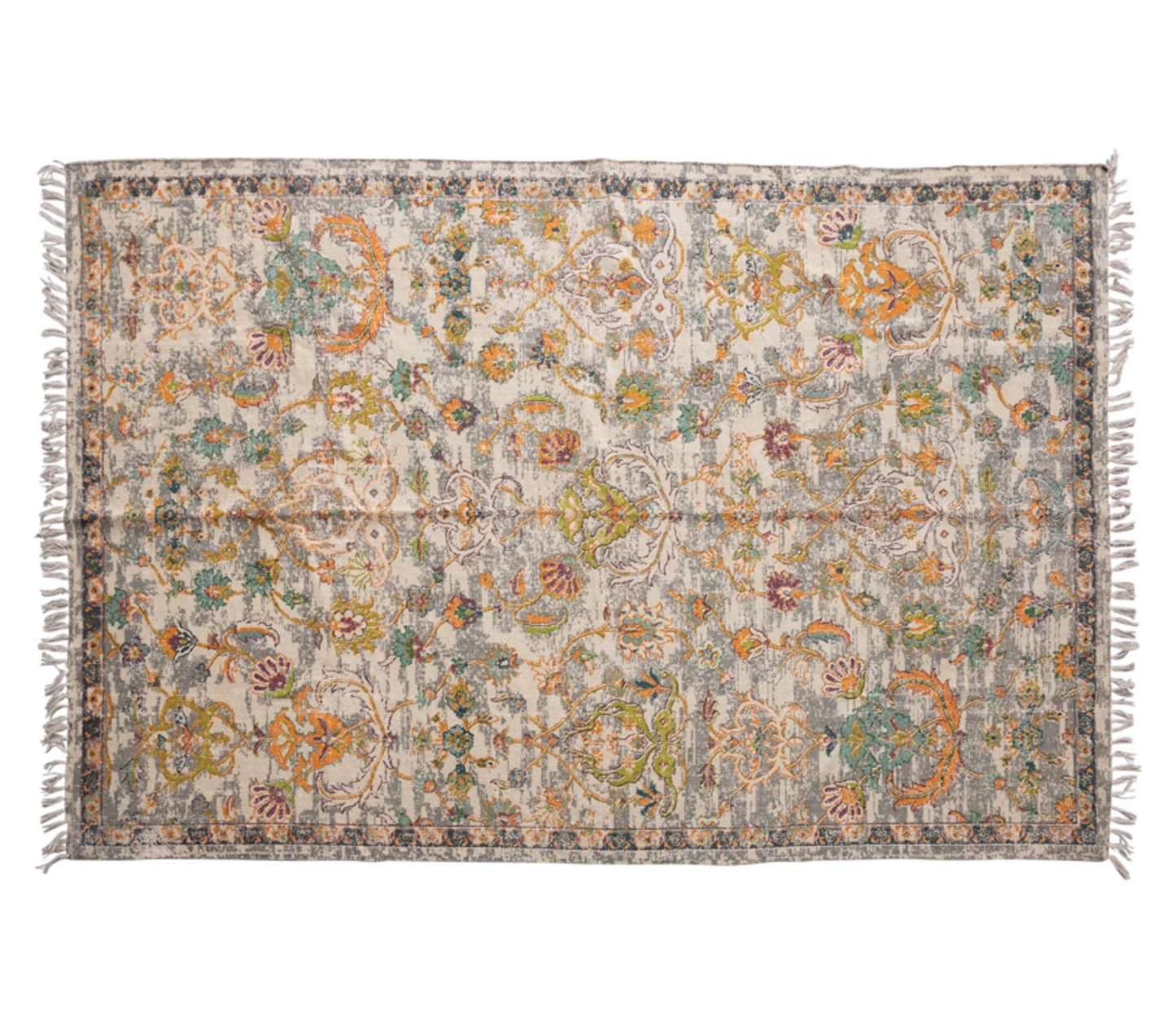 Woven Cotton Distressed Print Dhurrie Rug with Fringe