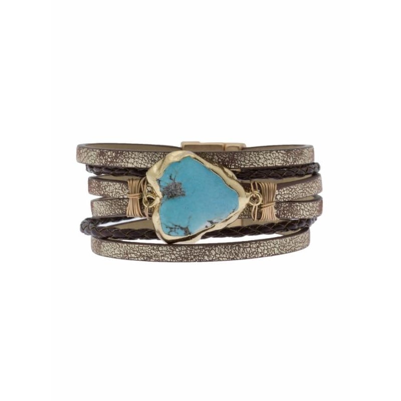 "Our beautiful Braided Turquoise Bracelet is where boho meets chic. The soft leather straps with a wonderful turquoise stone centerpiece fit comfortably around your wrist. Once you slip this on, you'll radiate mystical beauty.