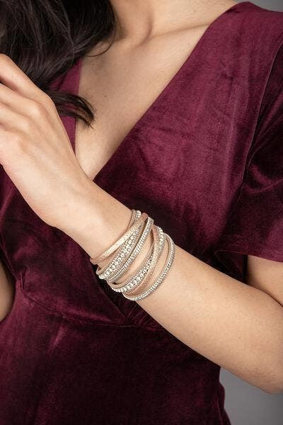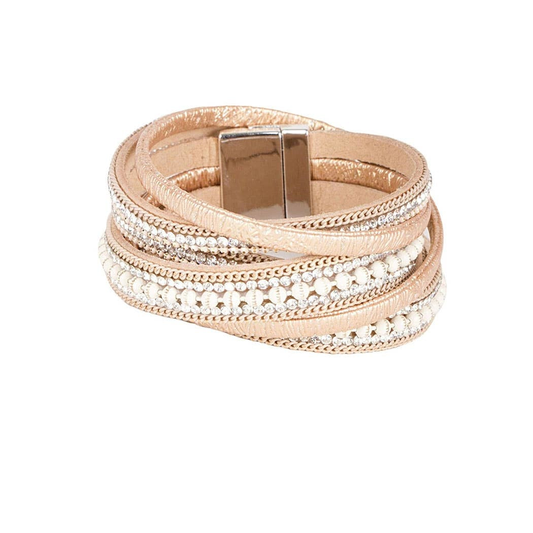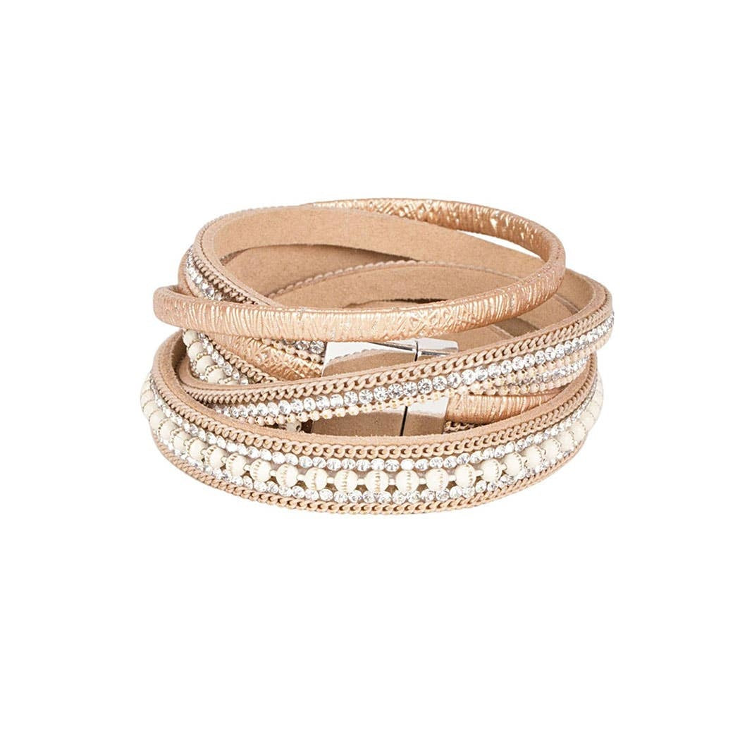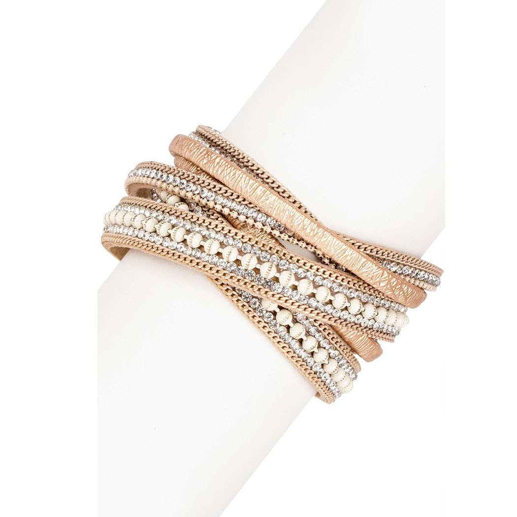 Saachi's must-have double wrap leather bracelet sparkles wonderfully with sparkling crystals. The wrap-around leather bracelet's visual attractiveness is enhanced by chain details and an array of beads.