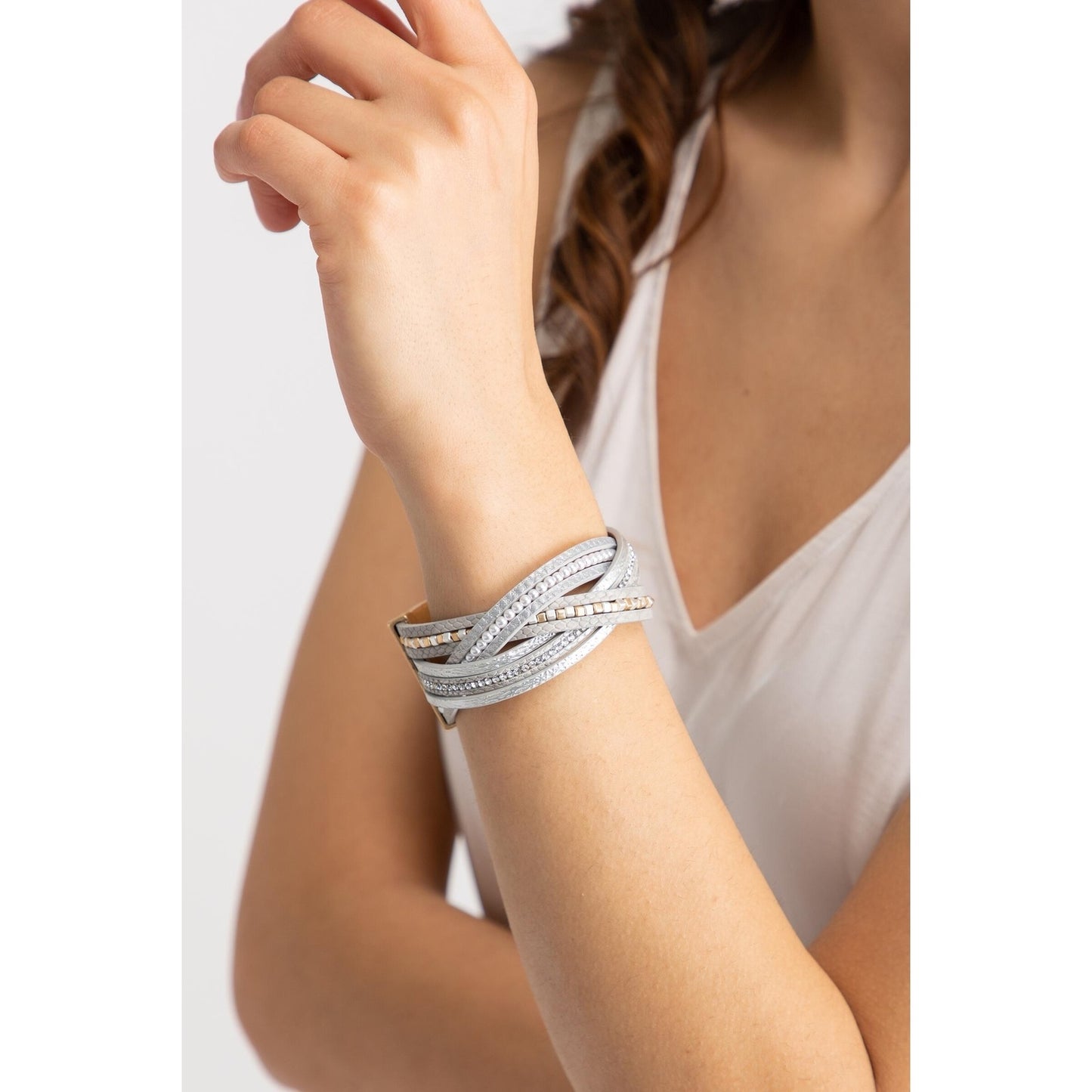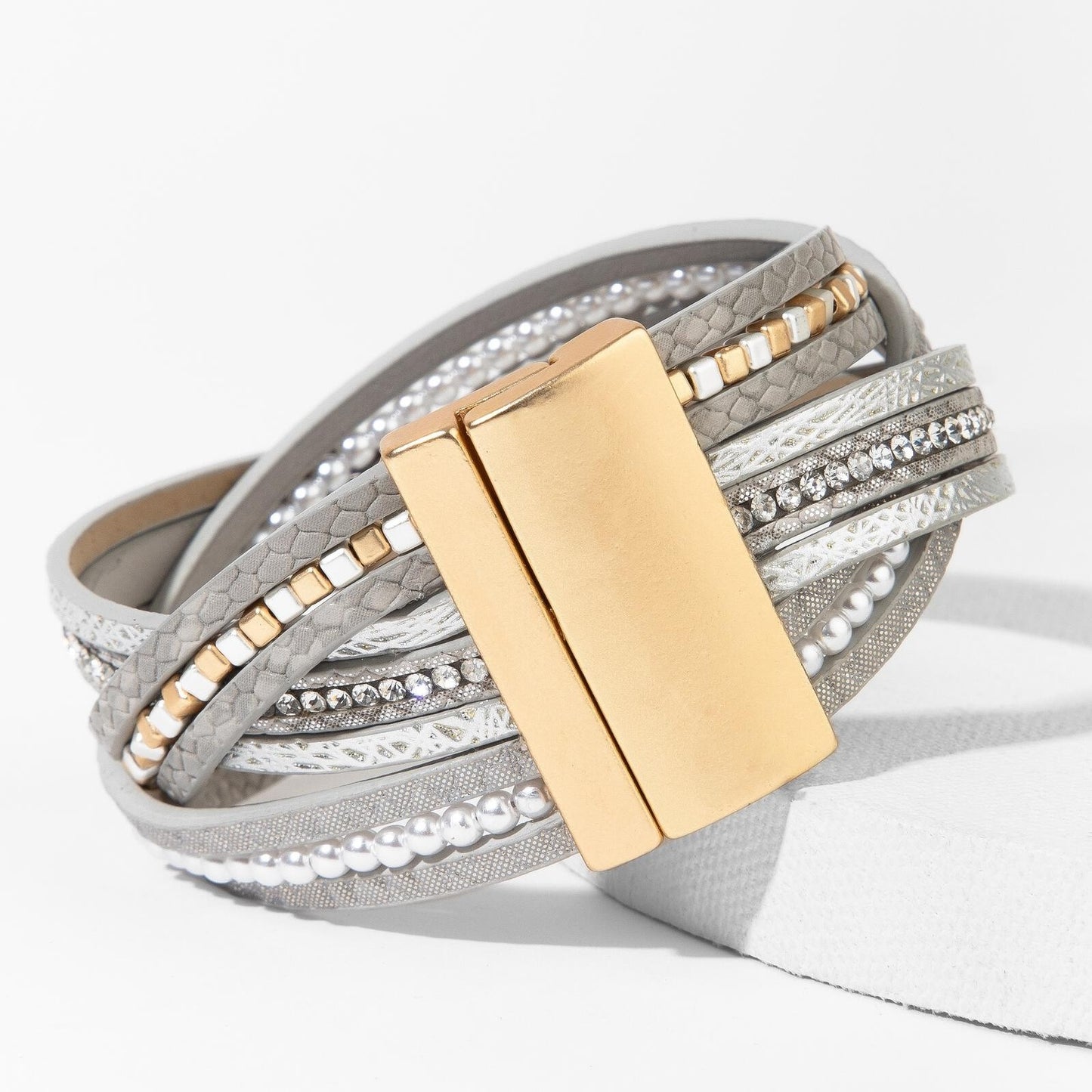 "Stark Mixed Bead Leather Bracelet features intertwined leather straps adorned with beads, pearls, and crystals. Secured by a magnetic clasp offers a comfortable fit without compromising the ultimate statement look.