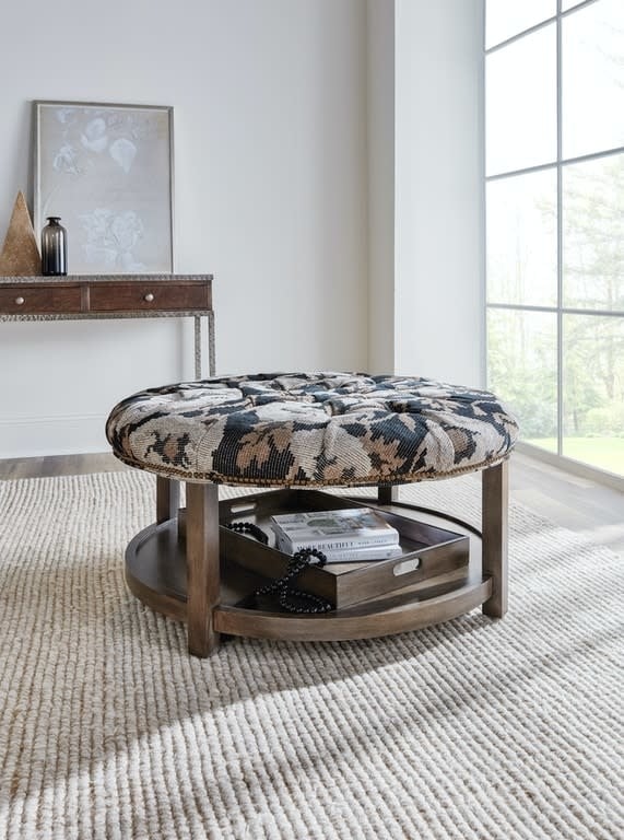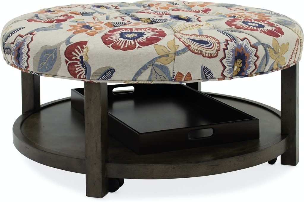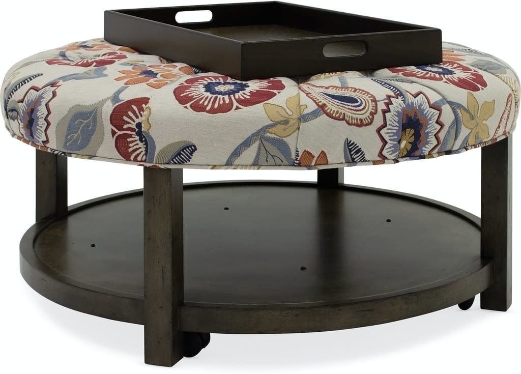 The solid wood trays are crafted to nest on the cocktail ottomans’ bottom shelf for storage when not in use. Strategically placed wooden positioning pins on the bottom shelf help to lock the trays in place.