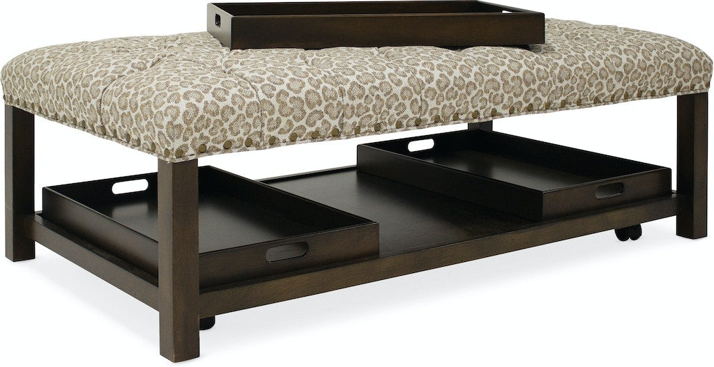 Introducing what we truly do best – great design, intricate, multi-step hand finishes and on-trend fabric offerings – to the occasional furniture category, the highly customizable Cocktails & More program offers a variety of options on eight upholstered cocktail tables, each of which include cocktail trays and casters. Available in round, square, oval or rectangle, the upholstered cocktail ottomans are available in a choice of more than 650 fabric options with tufted or non-tufted tops and a choice of eight finishes. An additional 15 Premier finishes – hand applied by our artisans – are also available, along with contrasting welt options and a choice of two sizes of nail-head detailing, available in four different finishes for further customization. Melding form with function, each style includes complementary solid wood serving trays for use in entertaining and hidden, locking casters for easy movement. The solid wood trays are crafted to nest on the cocktail ottomans’ bottom shelf for storage when not in use. Strategically placed wooden positioning pins on the bottom shelf help to lock the trays in place.