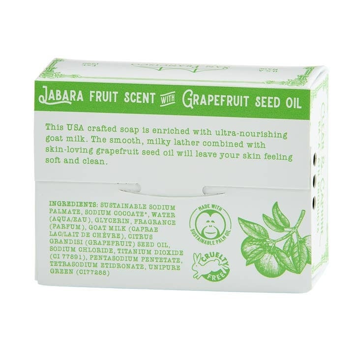 Our new Jabara fruit scented pressed goat milk bar soap enhanced with grapefruit seed oil.