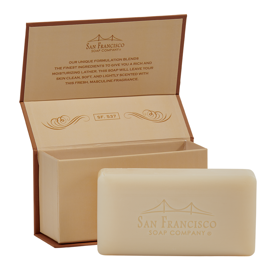 Lather, meet luxury. San Francisco Soap Company's Man Bars feature class-leading packaging with our highly giftable leather-textured boxes. Our unique formulation blends the finest ingredients to give you a rich and moisturizing wash.