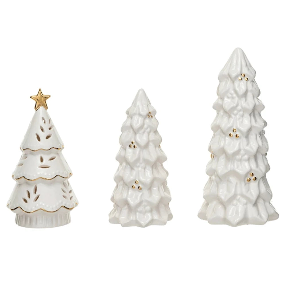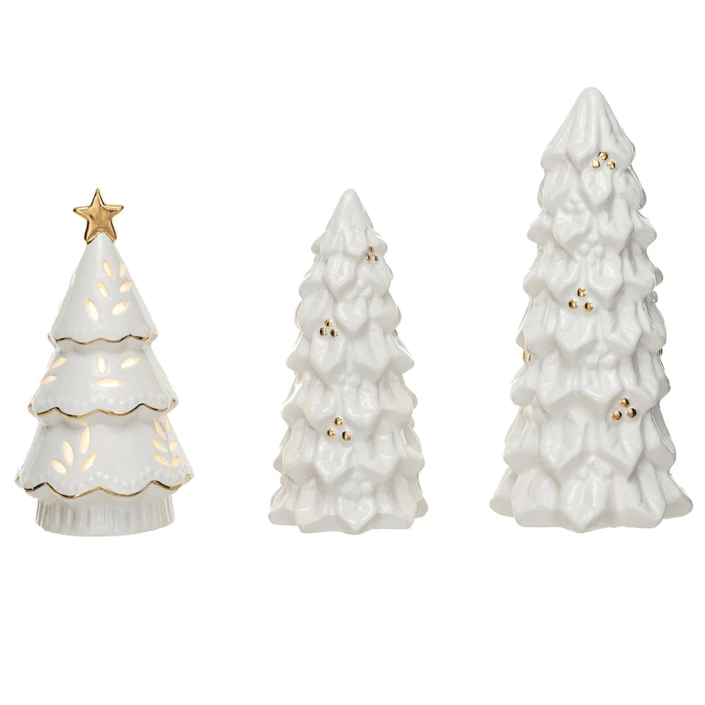 This charming set includes multiple stoneware Christmas trees, with one tree featuring an LED light for a soft, cozy glow.