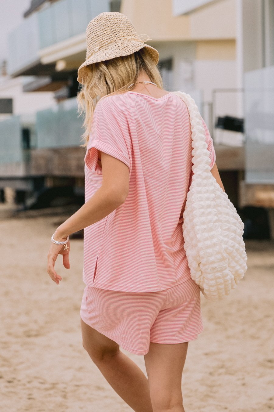 This striped reversed French terry set includes a short sleeve top and matching shorts, crafted for comfort and casual style. The soft, breathable fabric ensures all-day wearability, while the reversed terry texture adds subtle visual interest. Ideal for relaxed days or layering, this coordinated set offers effortless versatility with a refined, expert touch.
