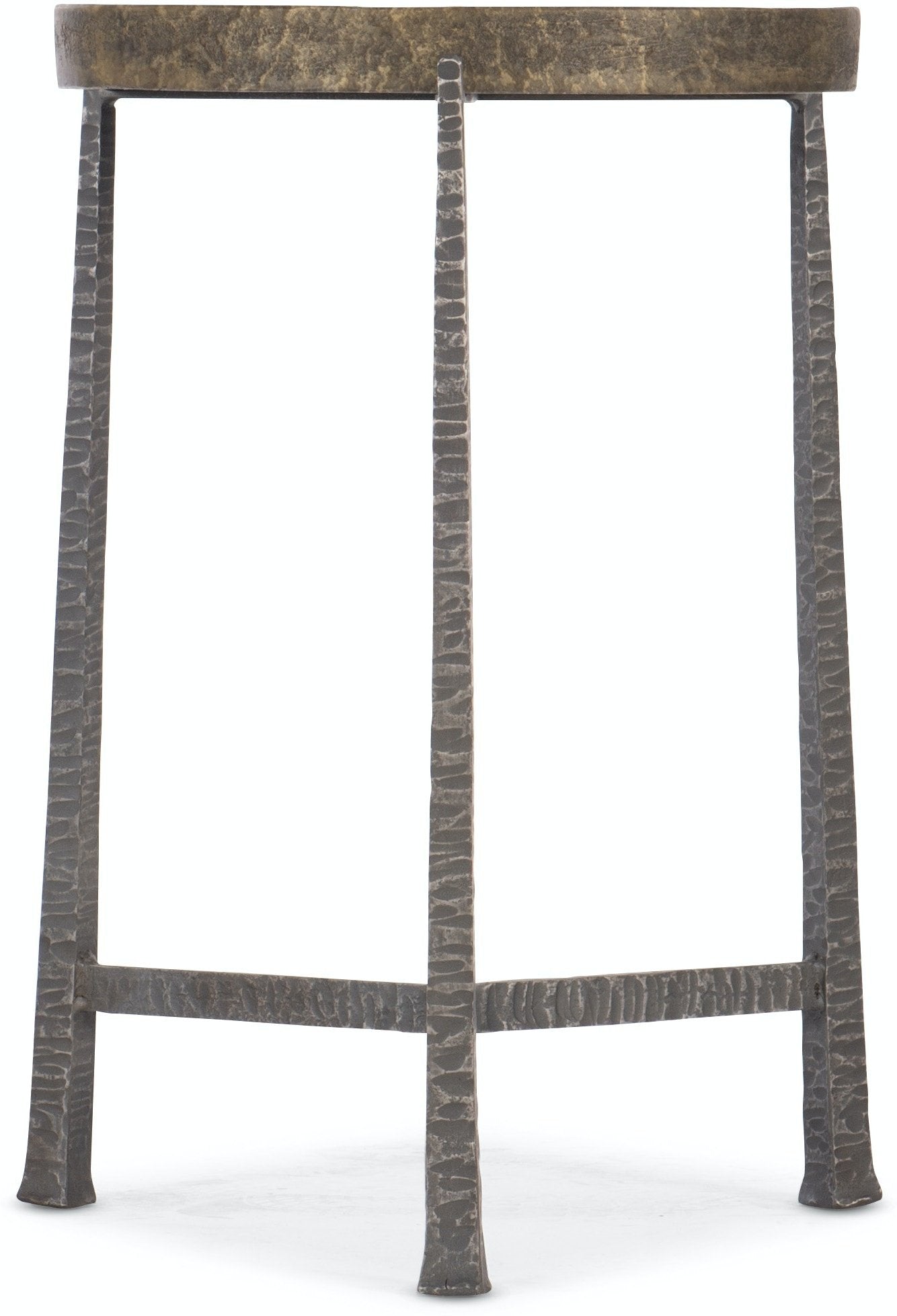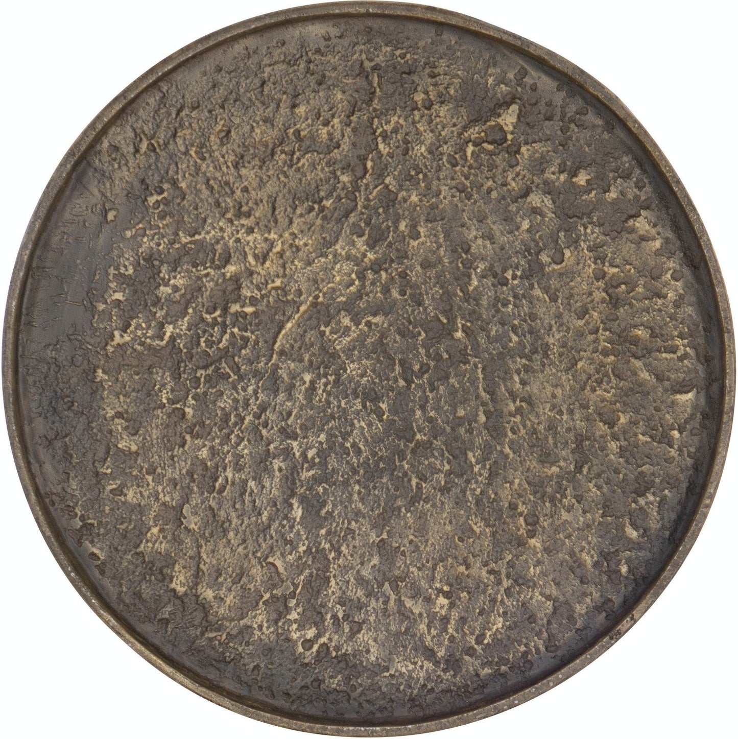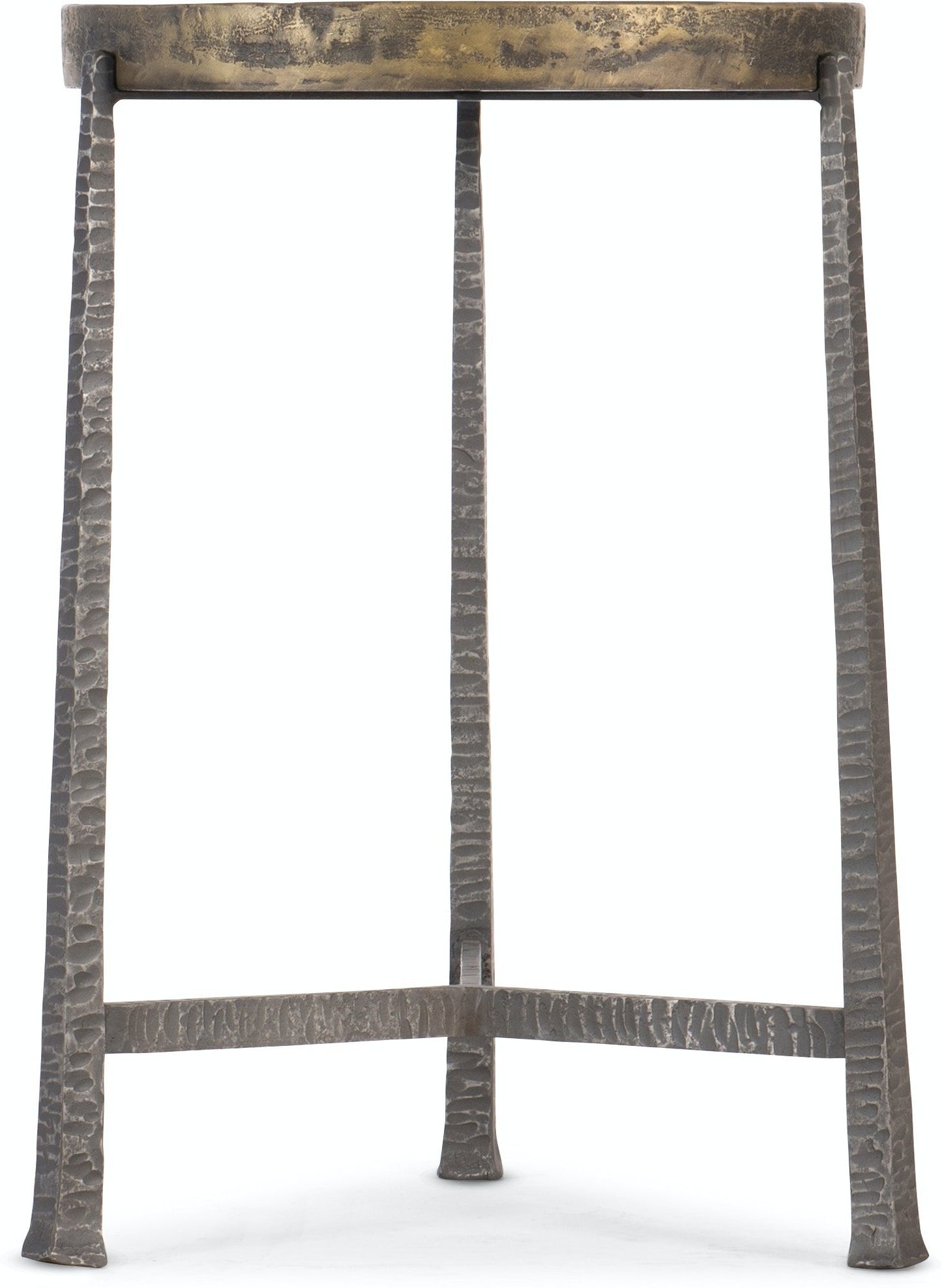 Crafted of hammered iron and cast aluminum in a distressed gold metal finish, the top sits on a metal base. Come closer to Melange, and you will discover something unexpected. An eclectic blending of colors, textures, and materials in a vibrant collection of one-of-a-kind artistic pieces, Melange is meant to inspire you and fuel an experience of self discovery, inspiring a renaissance in your home. Each piece of Melange has its own story. The designs are versatile and timeless, easily transcending from one life stage to the next, from home to home and generation to generation.