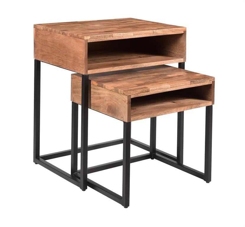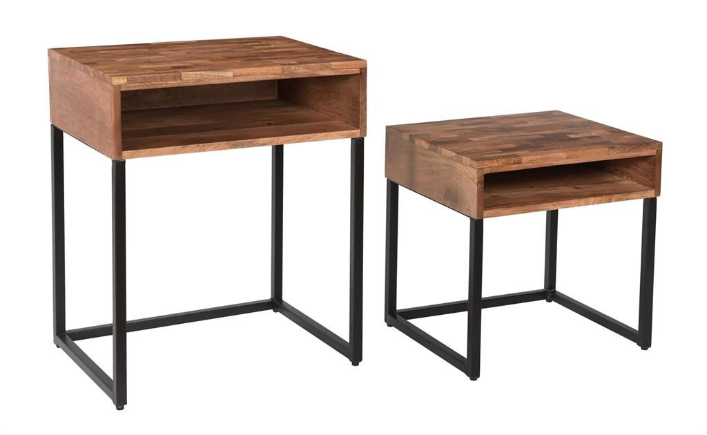 Made of mango wood which has been finished in a rich Baker's Natural, the tops have an open compartment where you can easily store books or magazines, keeping them within easy reach. The top surfaces have intricate pieced together designs, and both have a wonderful open metal base which has been powder coated a deep black. A dynamic duo!