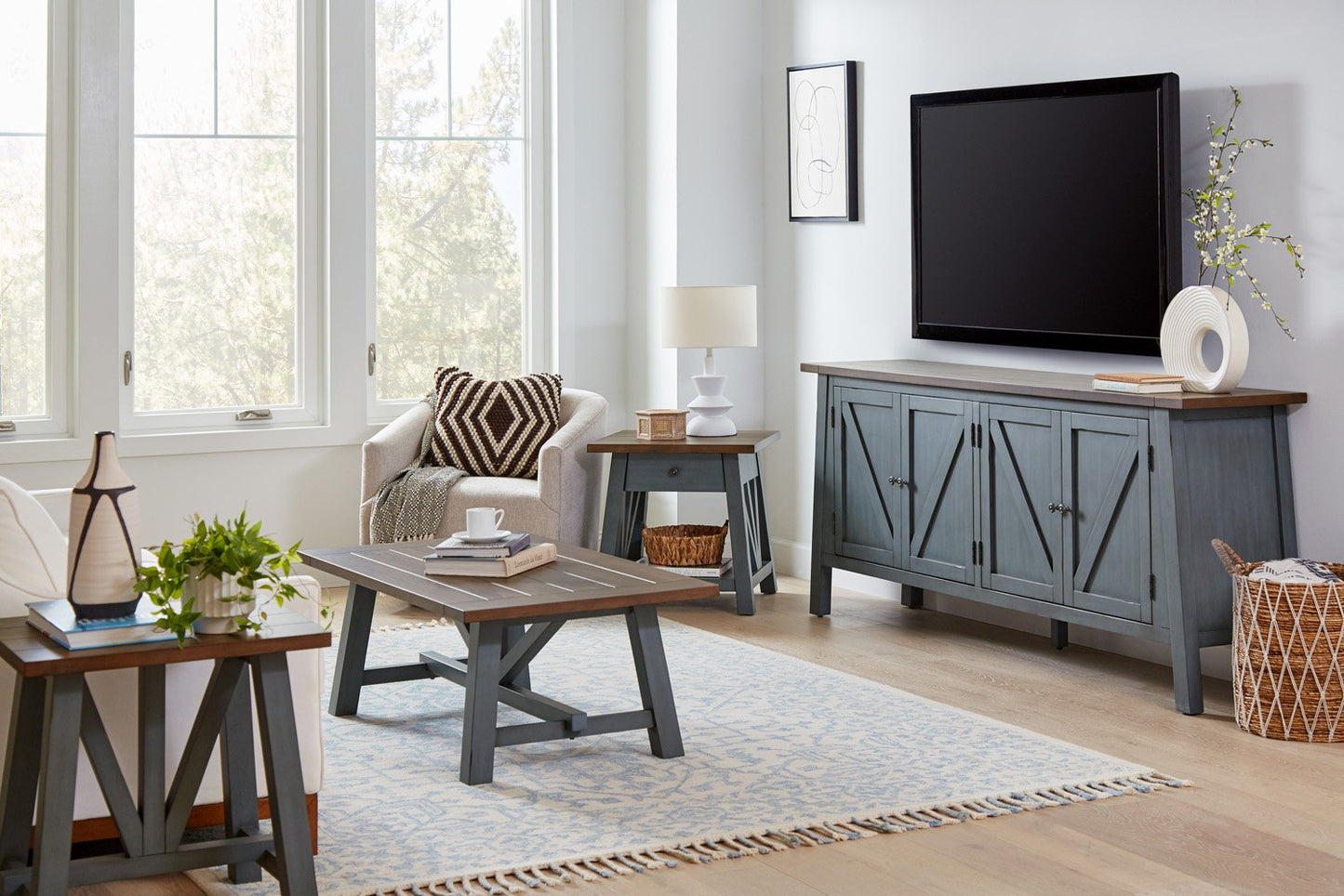 Pinebrook is a transitional collection of farmhouse style. Vintage inspired finish options, including a classic blue and a mix of finishes that compliment a blend of function and elements of modern farmhouse design.
