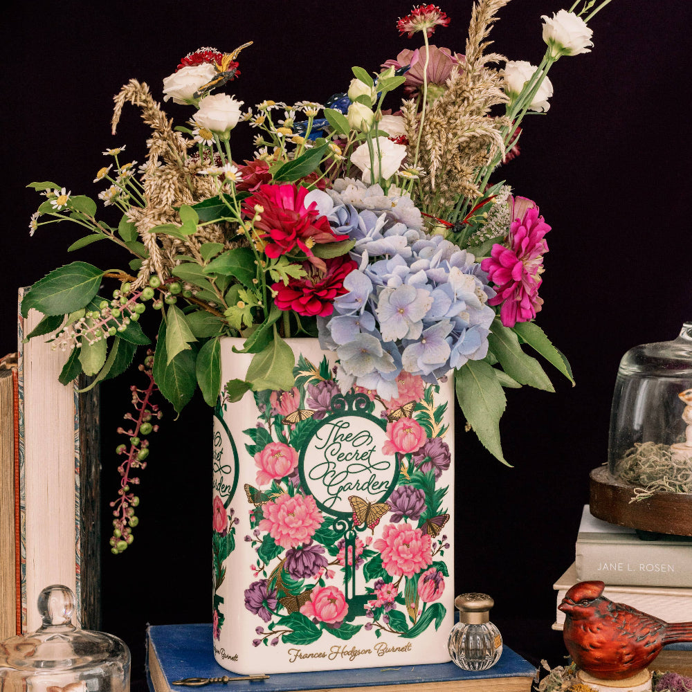 Bring a touch of literary elegance to your home with the Steel Mill & Co Large Ceramic Book Vase, inspired by Frances Hodgson Burnett’s beloved novel The Secret Garden.