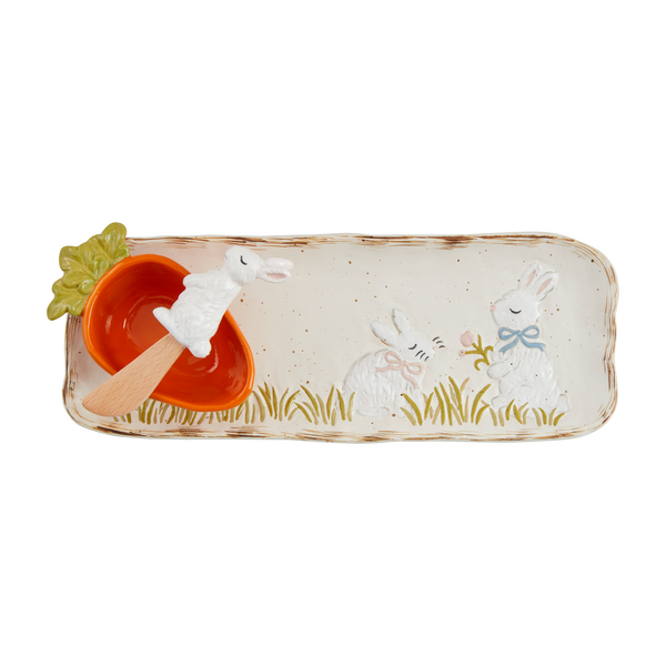 - Measuring 4 3/4" x 12 1/4", the tray provides ample space for serving a variety of appetizers or snacks. Accompanying the tray is a charming carrot-shaped dip cup, measuring 4" x 2 1/4", which is ideal for holding your favorite dips or sauces. The cup's playful design adds a whimsical touch that is sure to delight guests of all ages. Completing the set is a wooden spreader, measuring 5 1/2", featuring an adorable bunny handle. This spreader is perfect for serving soft cheeses, spreads, or butter, and its cute design makes it a delightful addition to any table setting. Whether you're hosting a festive gathering or simply enjoying a casual meal with family, this 3-piece set is sure to enhance your dining experience with its charming and functional design.