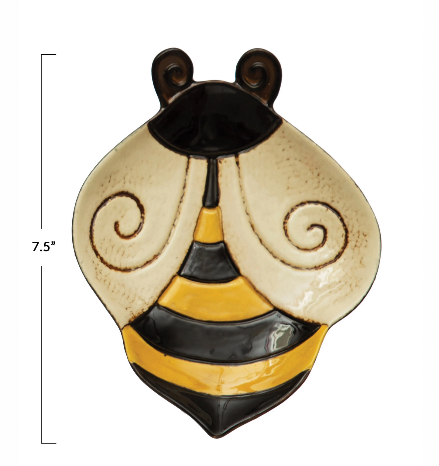 7-1/2"L x 6"W x 1"H Hand-Painted Stoneware Bee Plate, White, Black & Yellow