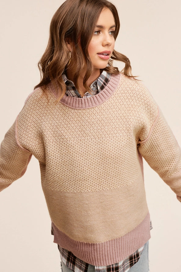 Loose Fit Color Block Textured Round Neck Sweater Beige Pink