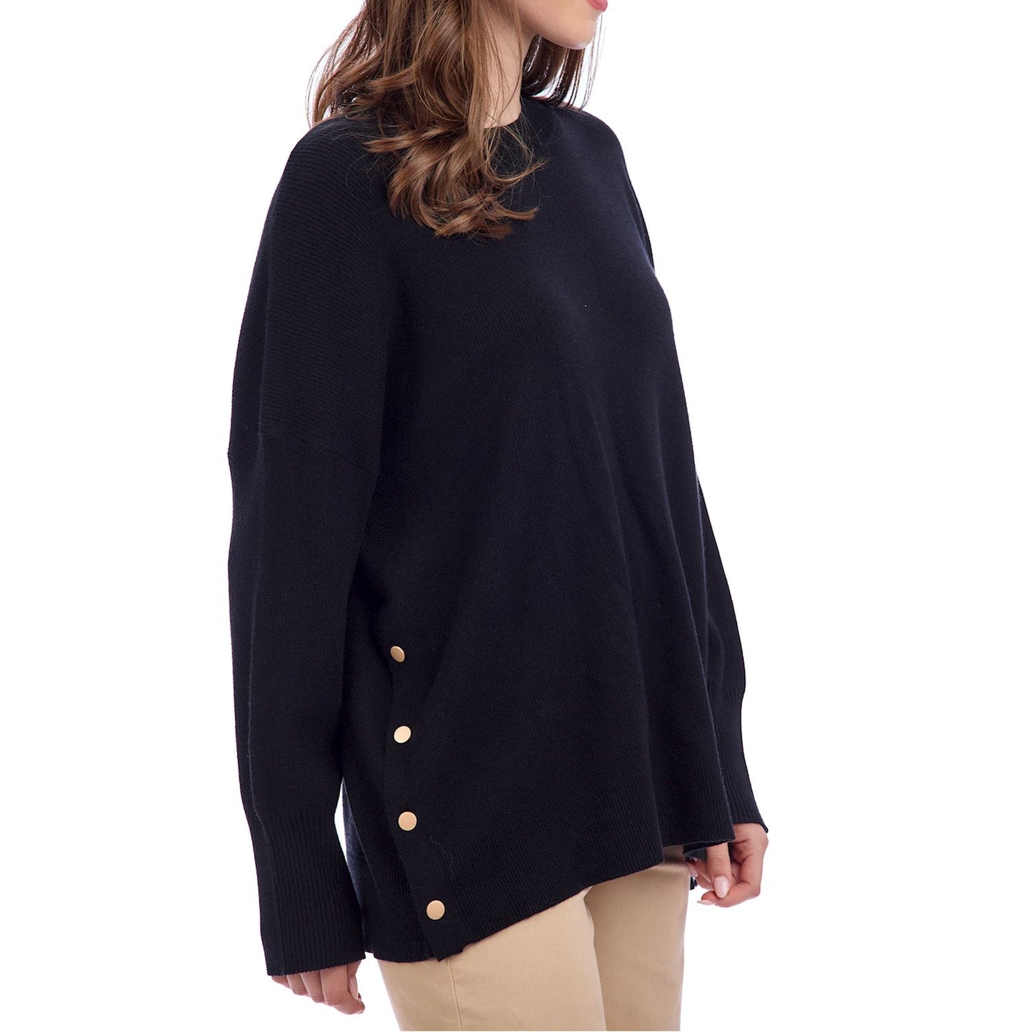 The Noralee Button Sweater is a stylish and versatile addition to any wardrobe. Crafted from a high-quality poly blend knit, this sweater offers a luxurious feel and a comfortable fit. The design features a unique side placket adorned with elegant brass buttons, adding a touch of sophistication to the overall look. The ribbed neckline, sleeve openings, and hem provide a classic finish, ensuring the sweater maintains its shape and style. With a one-size-fits-most design, it offers a flattering fit for various body types. Measuring approximately 27 inches from shoulder to hem, it provides ample coverage and can be easily paired with your favorite jeans or skirts for a chic ensemble. The fabric composition of 53% Rayon, 26% Polyester, and 21% Nylon ensures durability and a soft texture, making it a perfect choice for both casual and dressy occasions.
