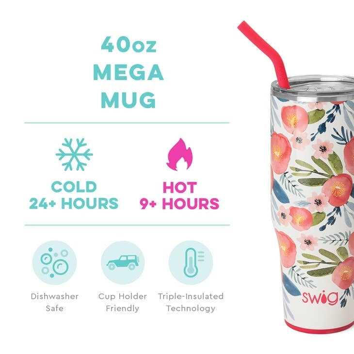 Mega sips, Mega chills! Hydrating has never been easier with our 40oz Mega Mug! The cup holder friendly frame, comfort-grip handle and flexi-tip straw with a standard, plastic straw base come together to create their new favorite Swig!