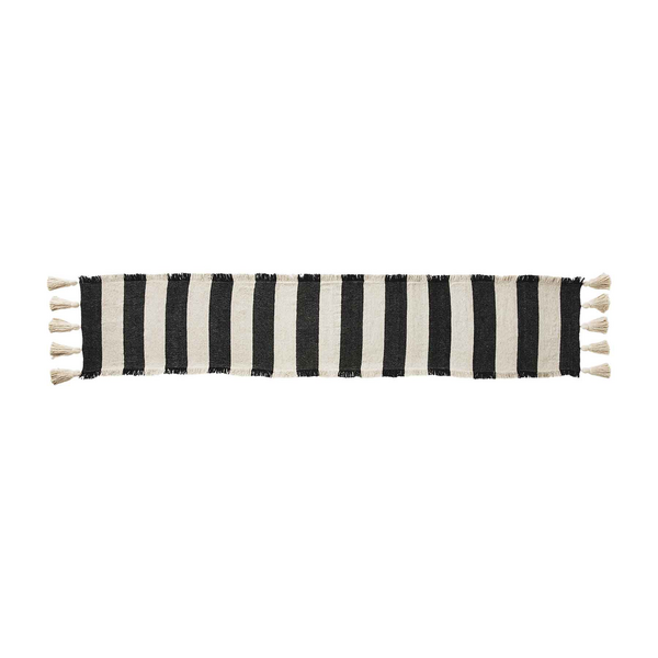 There's so much to celebrate with our Ponchaa Black Stripe Table Runner. The table runner is made of ponchaa cotton. The Table Runner features a chunky tassel hem.