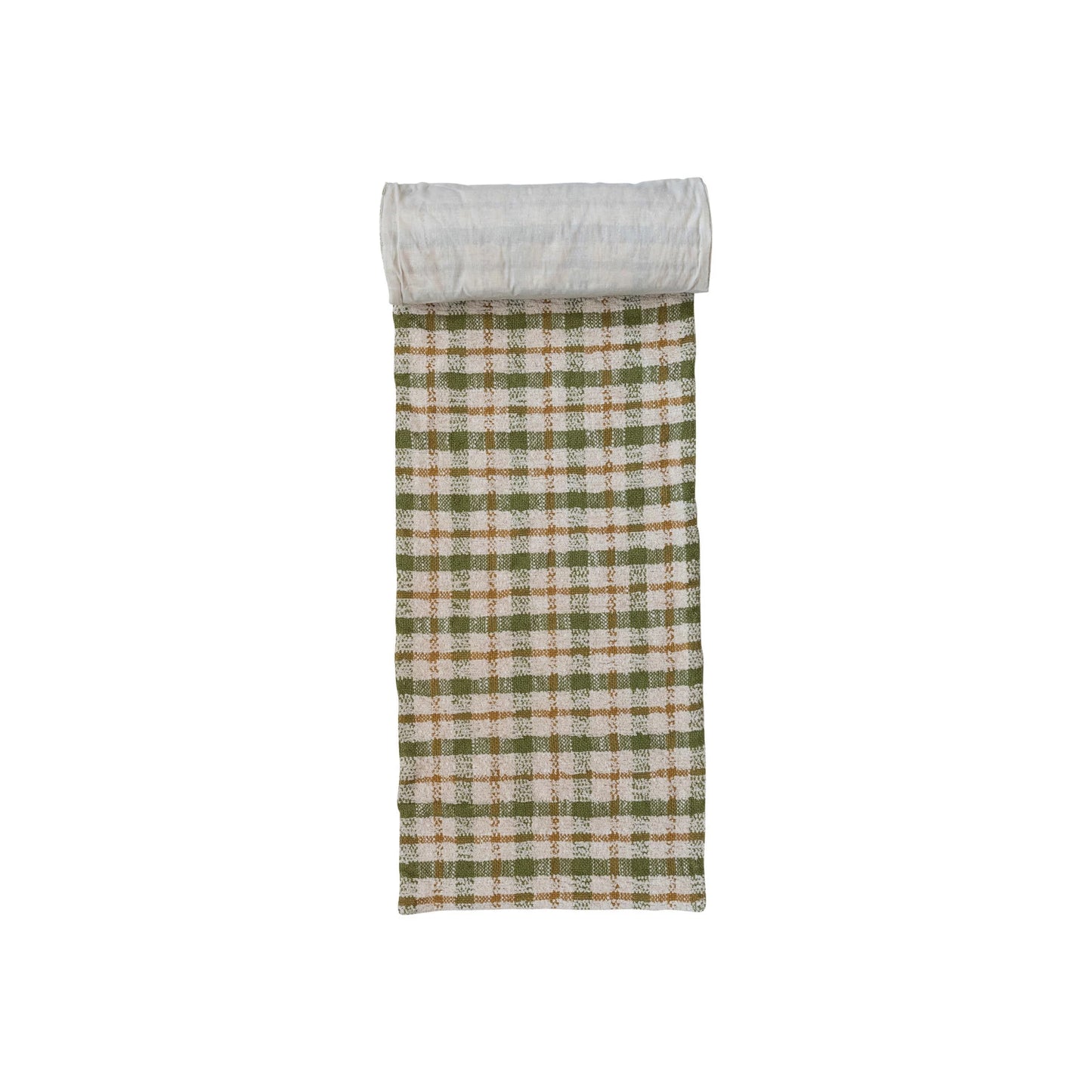 Add some warmth and charm to the dining table with this woven cotton table runner in cream, green, and yellow plaid.