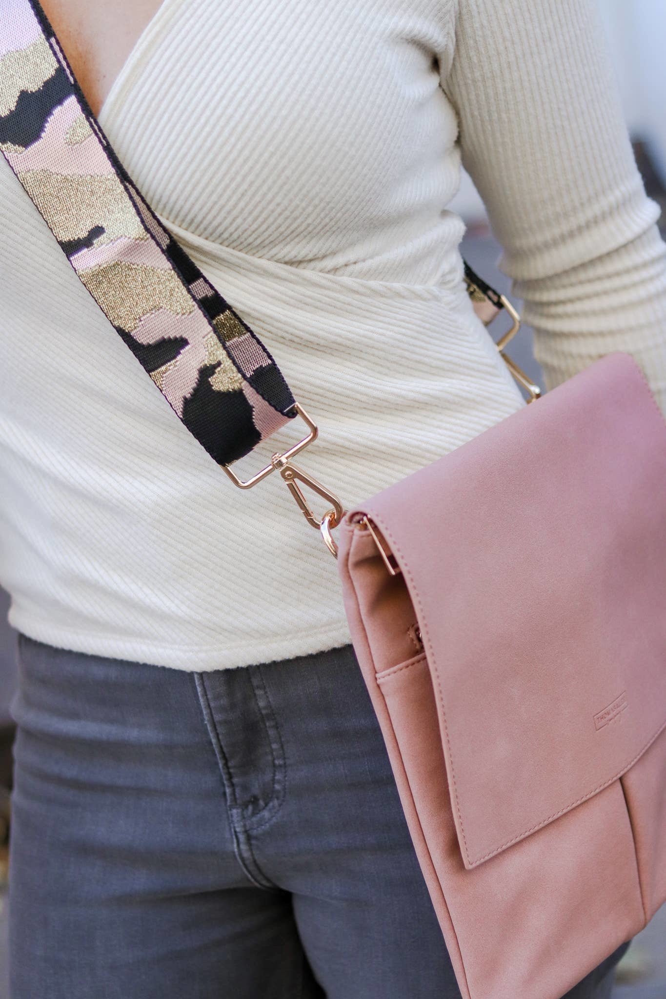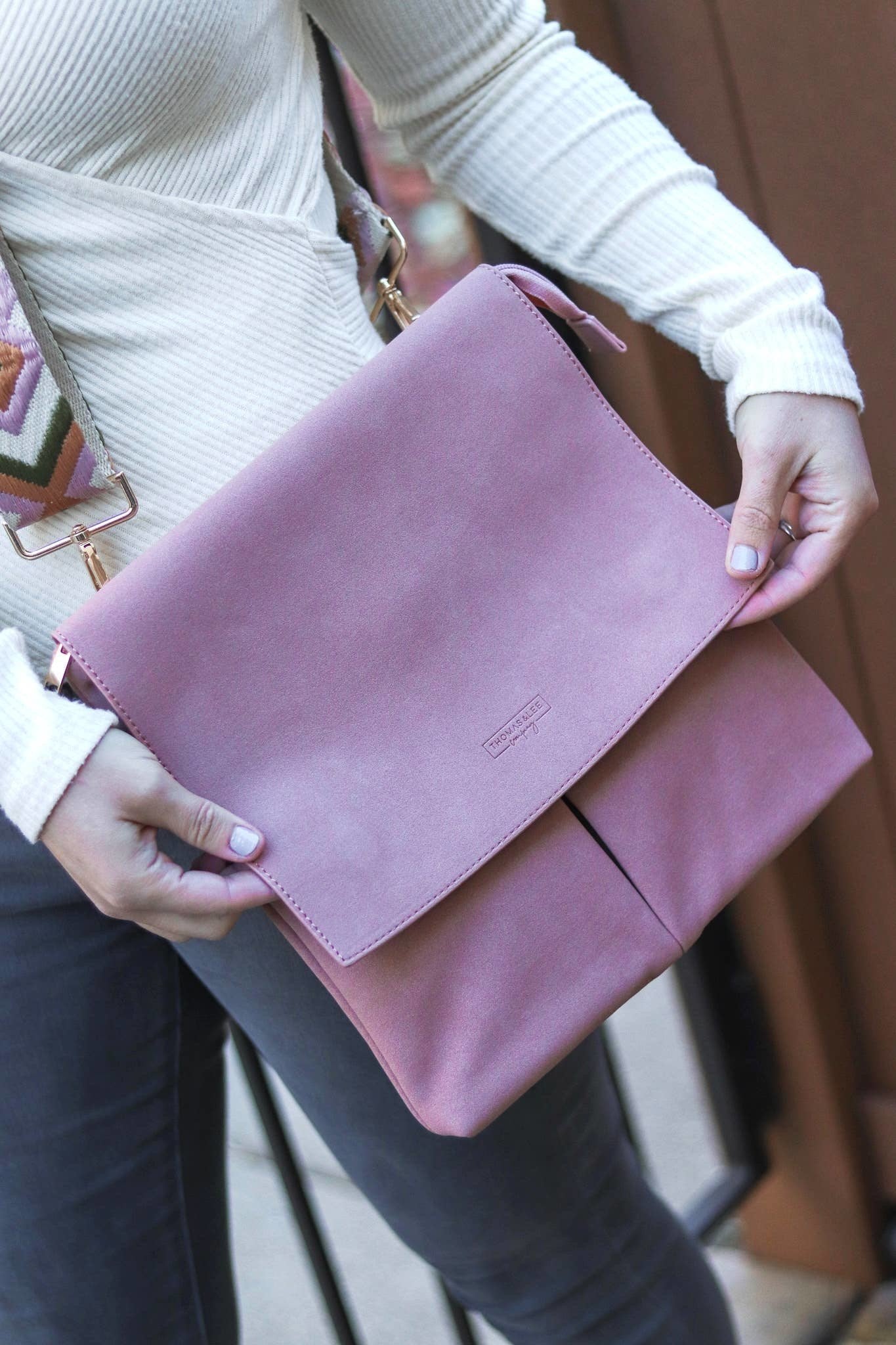 Made of luxurious suede and accented with a interchangeable crossbody strap sold separately. This handbag has a magnetic flap, with zippered closure, two interior pockets, and ample storage.