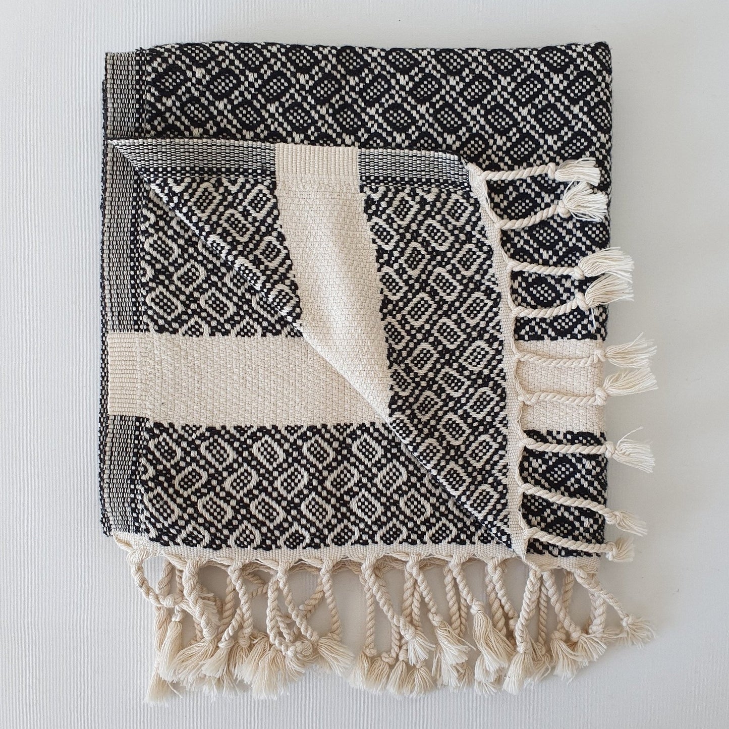 They are woven in a reversible black pattern and have a creme border complementing creme, and hand-spun tassels on the top and bottom edges.